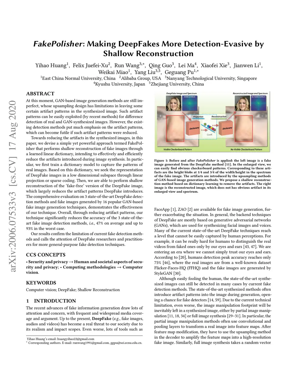 At this moment, GAN-based image generation methods are still imperfect, whose upsampling design has limitations in leaving some certain artifact patterns in the synthesized image. Such artifact patterns can be easily exploited (by recent methods) for difference detection of real and GAN-synthesized images. However, the existing detection methods put much emphasis on the artifact patterns, which can become futile if such artifact patterns were reduced. Towards reducing the artifacts in the synthesized images, in this paper, we devise a simple yet powerful approach termed FakePolisher that performs shallow reconstruction of fake images through a learned linear dictionary, intending to effectively and efficiently reduce the artifacts introduced during image synthesis. The comprehensive evaluation on 3 state-of-the-art DeepFake detection methods and fake images generated by 16 popular GAN-based fake image generation techniques, demonstrates the effectiveness of our technique.Overall, through reducing artifact patterns, our technique significantly reduces the accuracy of the 3 state-of-the-art fake image detection methods, i.e., 47% on average and up to 93% in the worst case.
