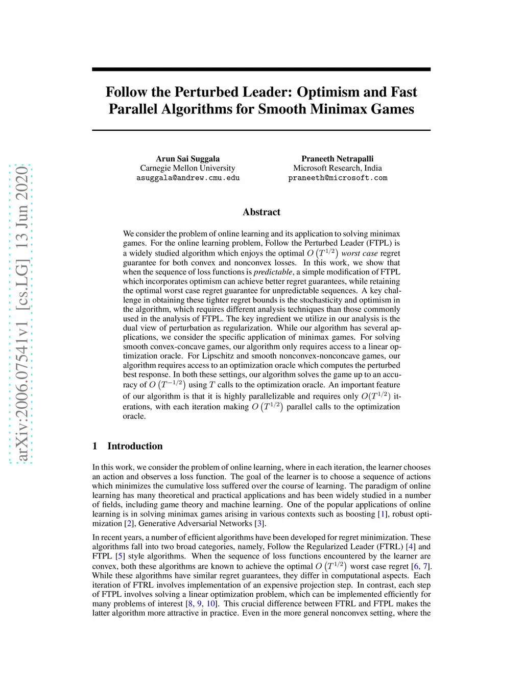 We consider the problem of online learning and its application to solving minimax games. For the online learning problem, Follow the Perturbed Leader (FTPL) is a widely studied algorithm which enjoys the optimal worst-case regret guarantee for both convex and nonconvex losses. In this work, we show that when the sequence of loss functions is predictable, a simple modification of FTPL which incorporates optimism can achieve better regret guarantees, while retaining the optimal worst-case regret guarantee for unpredictable sequences. A key challenge in obtaining these tighter regret bounds is the stochasticity and optimism in the algorithm, which requires different analysis techniques than those commonly used in the analysis of FTPL. The key ingredient we utilize in our analysis is the dual view of perturbation as regularization. While our algorithm has several applications, we consider the specific application of minimax games. For solving smooth convex-concave games, our algorithm only requires access to a linear optimization oracle. For Lipschitz and smooth nonconvex-nonconcave games, our algorithm requires access to an optimization oracle which computes the perturbed best response. In both these settings, our algorithm solves the game up to an accuracy of using calls to the optimization oracle. An important feature of our algorithm is that it is highly parallelizable and requires only iterations, with each iteration making parallel calls to the optimization oracle.