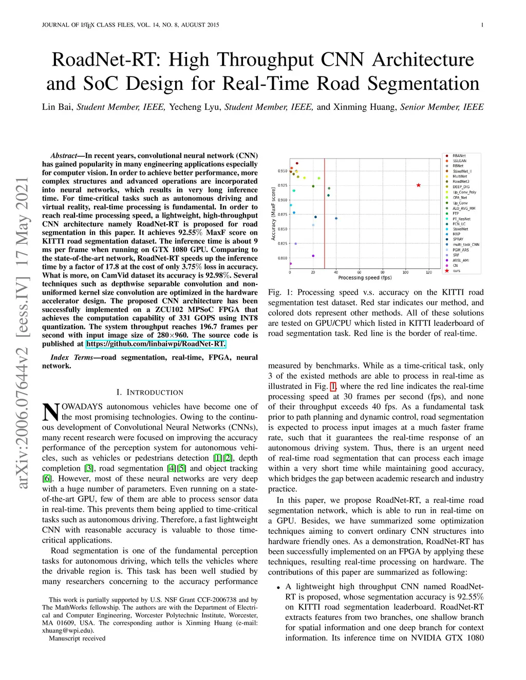 In recent years, convolutional neural network has gained popularity in many engineering applications especially for computer vision. In order to achieve better performance, often more complex structures and advanced operations are incorporated into the neural networks, which results very long inference time. For time-critical tasks such as autonomous driving and virtual reality, real-time processing is fundamental. In order to reach real-time process speed, a light-weight, high-throughput CNN architecture namely RoadNet-RT is proposed for road segmentation in this paper. It achieves 90.33% MaxF score on test set of KITTI road segmentation task and 8 ms per frame when running on GTX 1080 GPU. Comparing to the state-of-the-art network, RoadNet-RT speeds up the inference time by a factor of 20 at the cost of only 6.2% accuracy loss. For hardware design optimization, several techniques such as depthwise separable convolution and non-uniformed kernel size convolution are customized designed to further reduce the processing time. The proposed CNN architecture has been successfully implemented on an FPGA ZCU102 MPSoC platform that achieves the computation capability of 83.05 GOPS. The system throughput reaches 327.9 frames per second with image size 1216x176.