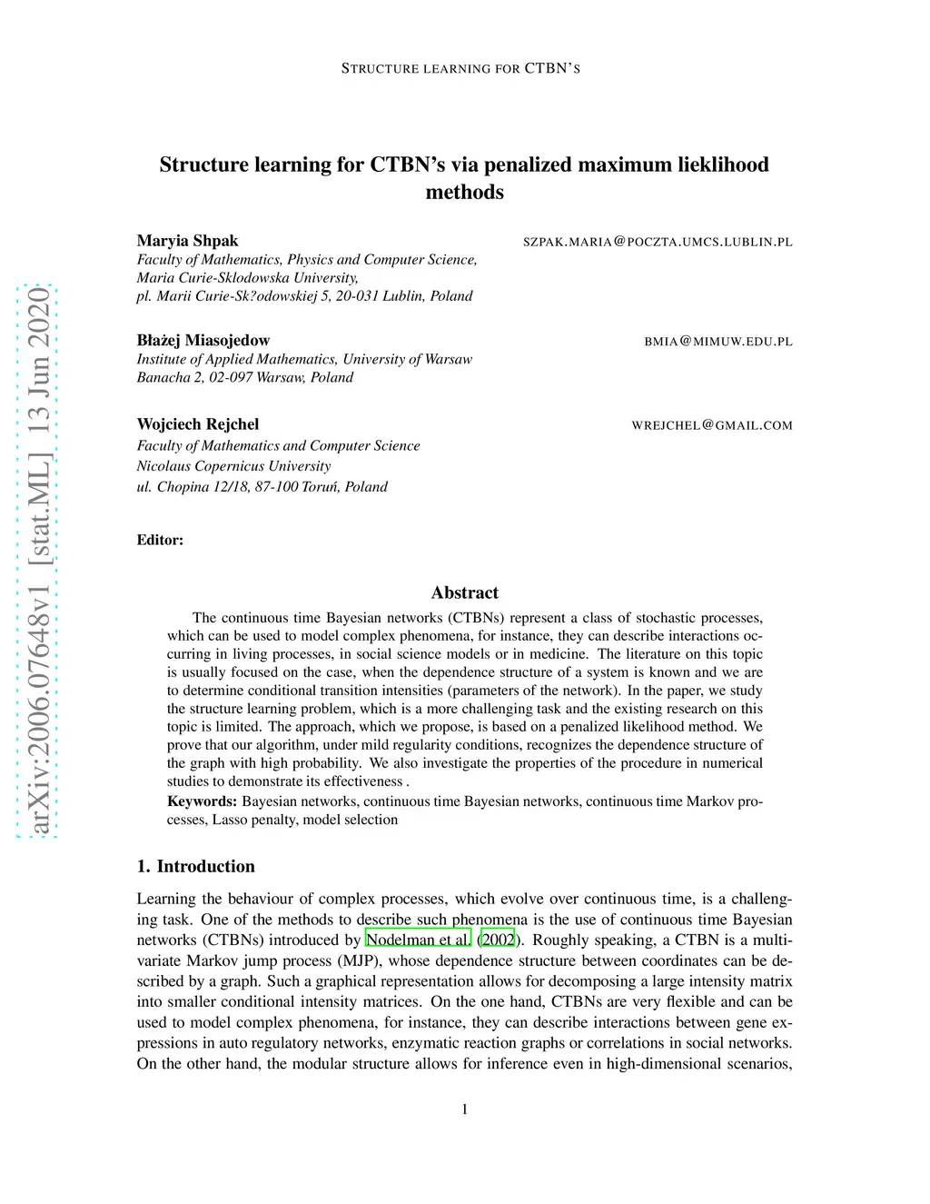 Structure learning for CTBN's via penalized maximum likelihood methods