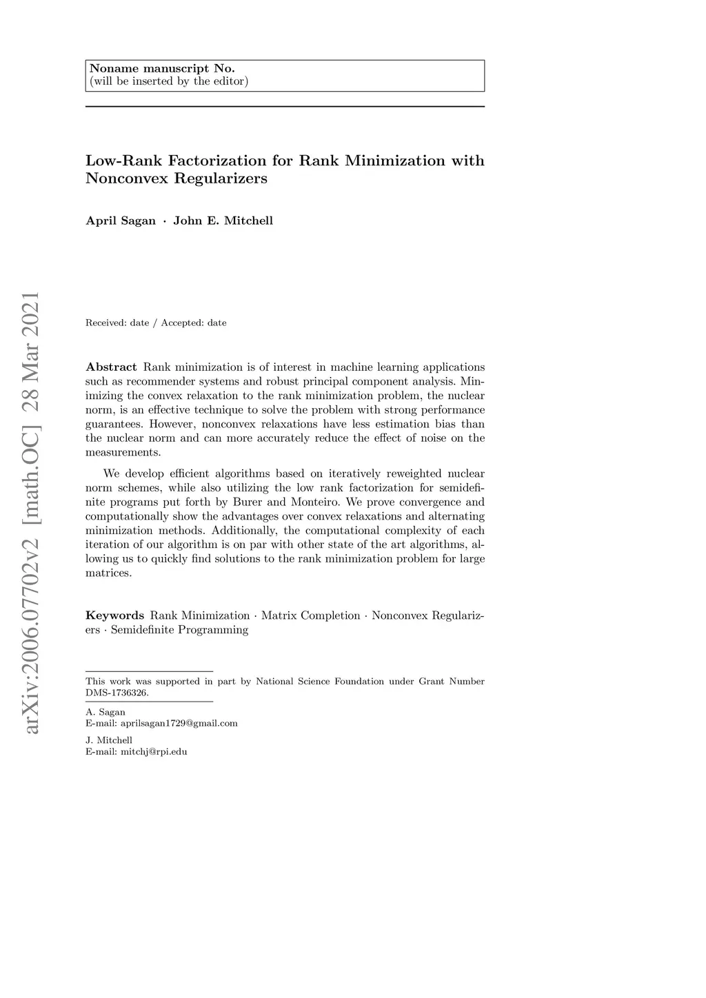 Rank minimization is of interest in machine learning applications such as recommender systems and robust principal component analysis. Minimizing the convex relaxation to the rank minimization problem, the nuclear norm, is an effective technique to solve the problem with strong performance guarantees. However, nonconvex relaxations have less estimation bias than the nuclear norm and can more accurately reduce the effect of noise on the measurements. We develop efficient algorithms based on iteratively reweighted nuclear norm schemes, while also utilizing the low rank factorization for semidefinite programs put forth by Burer and Monteiro. We prove convergence and computationally show the advantages over convex relaxations and alternating minimization methods. Additionally, the computational complexity of each iteration of our algorithm is on par with other state of the art algorithms, allowing us to quickly find solutions to the rank minimization problem for large matrices.