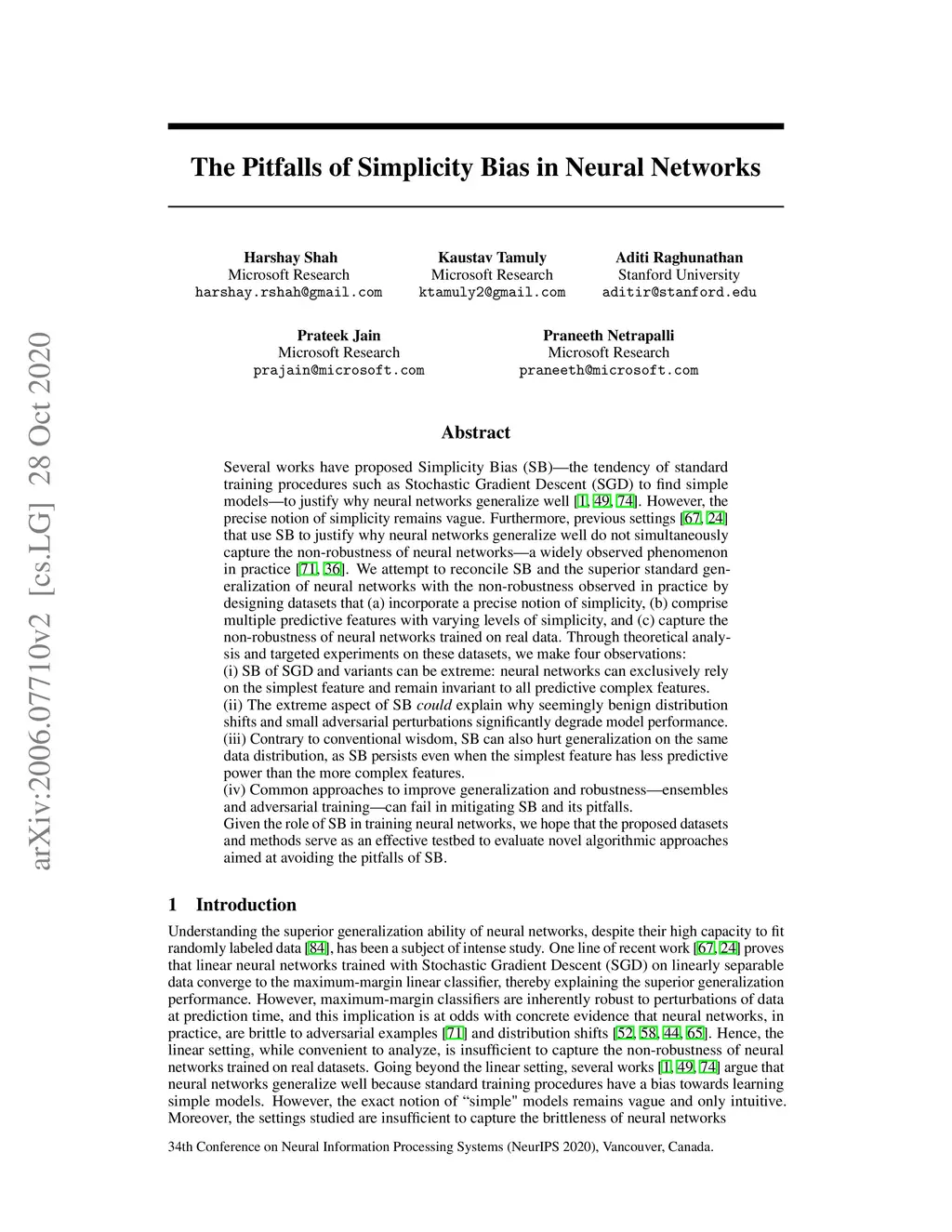 Several works have proposed Simplicity Bias (SB)---the tendency of standard training procedures such as Stochastic Gradient Descent (SGD) to find simple models---to justify why neural networks generalize well [Arpit et al. 2017, Nakkiran et al. 2019, Soudry et al. 2018]. However, the precise notion of simplicity remains vague. Furthermore, previous settings that use SB to theoretically justify why neural networks generalize well do not simultaneously capture the non-robustness of neural networks---a widely observed phenomenon in practice [Goodfellow et al. 2014, Jo and Bengio 2017]. We attempt to reconcile SB and the superior standard generalization of neural networks with the non-robustness observed in practice by designing datasets that (a) incorporate a precise notion of simplicity, (b) comprise multiple predictive features with varying levels of simplicity, and (c) capture the non-robustness of neural networks trained on real data. Through theory and empirics on these datasets, we make four observations: (i) SB of SGD and variants can be extreme: neural networks can exclusively rely on the simplest feature and remain invariant to all predictive complex features. (ii) The extreme aspect of SB could explain why seemingly benign distribution shifts and small adversarial perturbations significantly degrade model performance. (iii) Contrary to conventional wisdom, SB can also hurt generalization on the same data distribution, as SB persists even when the simplest feature has less predictive power than the more complex features. (iv) Common approaches to improve generalization and robustness---ensembles and adversarial training---can fail in mitigating SB and its pitfalls. Given the role of SB in training neural networks, we hope that the proposed datasets and methods serve as an effective testbed to evaluate novel algorithmic approaches aimed at avoiding the pitfalls of SB.