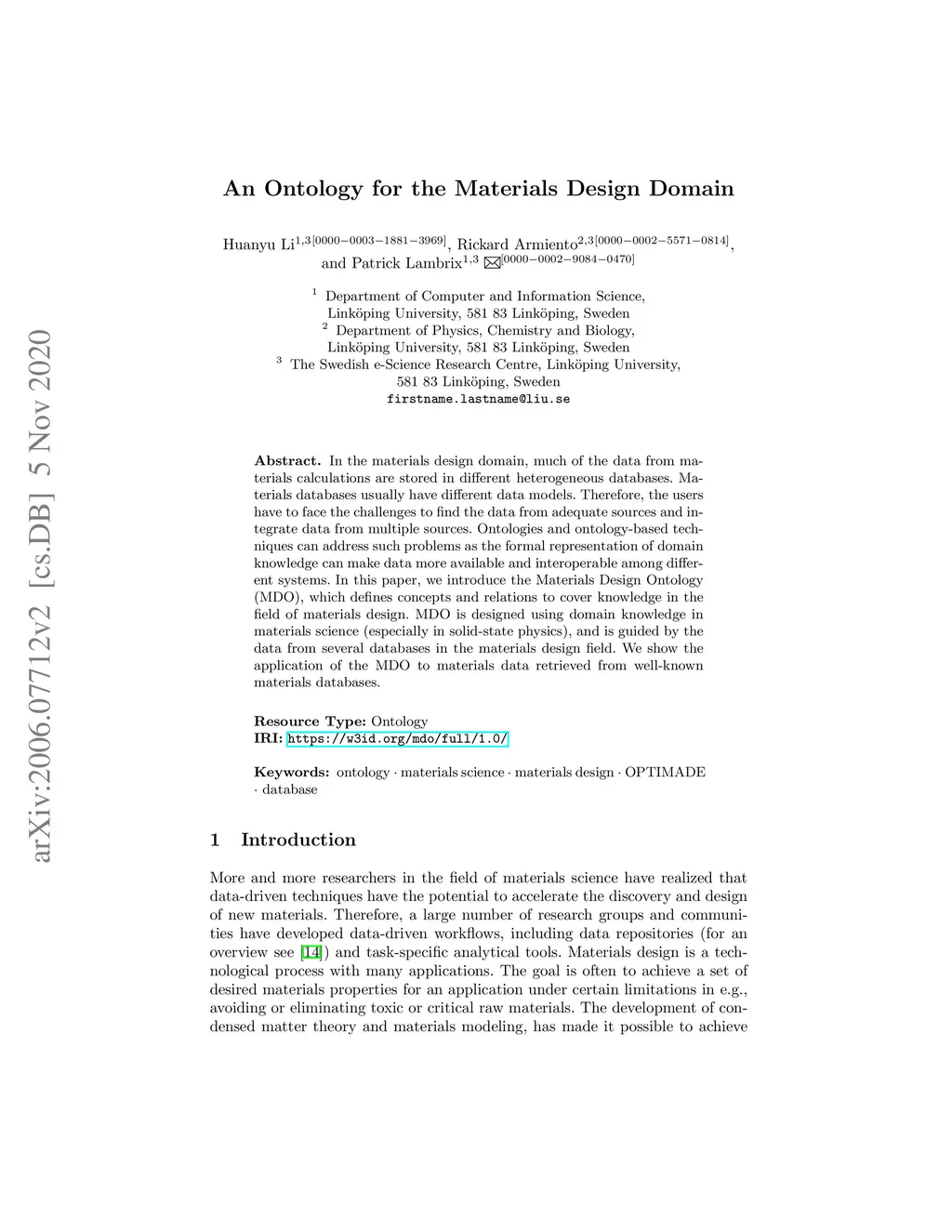 In the materials design domain, much of the data from materials calculations are stored in different heterogeneous databases. Materials databases usually have different data models. Therefore, the users have to face the challenges to find the data from adequate sources and integrate data from multiple sources. Ontologies and ontology-based techniques can address such problems as the formal representation of domain knowledge can make data more available and interoperable among different systems. In this paper, we introduce the Materials Design Ontology (MDO), which defines concepts and relations to cover knowledge in the field of materials design. MDO is designed using domain knowledge in materials science (especially in solid-state physics), and is guided by the data from several databases in the materials design field. We show the application of the MDO to materials data retrieved from well-known materials databases.