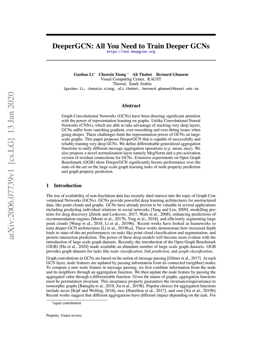 Graph Convolutional Networks (GCNs) have been drawing significant attention with the power of representation learning on graphs. Unlike Convolutional Neural Networks (CNNs), which are able to take advantage of stacking very deep layers, GCNs suffer from vanishing gradient, over-smoothing and over-fitting issues when going deeper. These challenges limit the representation power of GCNs on large-scale graphs. This paper proposes DeeperGCN that is capable of successfully and reliably training very deep GCNs. We define differentiable generalized aggregation functions to unify different message aggregation operations (e.g. mean, max). We also propose a novel normalization layer namely MsgNorm and a pre-activation version of residual connections for GCNs. Extensive experiments on Open Graph Benchmark (OGB) show DeeperGCN significantly boosts performance over the state-of-the-art on the large scale graph learning tasks of node property prediction and graph property prediction. Please visit https://www.deepgcns.org for more information.