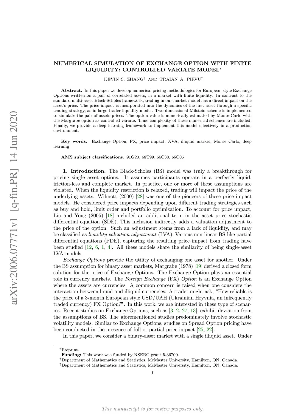 In this paper we develop numerical pricing methodologies for European style Exchange Options written on a pair of correlated assets, in a market with finite liquidity. In contrast to the standard multi-asset Black-Scholes framework, trading in our market model has a direct impact on the asset's price. The price impact is incorporated into the dynamics of the first asset through a specific trading strategy, as in large trader liquidity model. Two-dimensional Milstein scheme is implemented to simulate the pair of assets prices. The option value is numerically estimated by Monte Carlo with the Margrabe option as controlled variate. Time complexity of these numerical schemes are included. Finally, we provide a deep learning framework to implement this model effectively in a production environment.