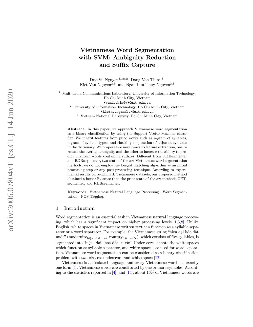 Vietnamese Word Segmentation with SVM: Ambiguity Reduction and Suffix