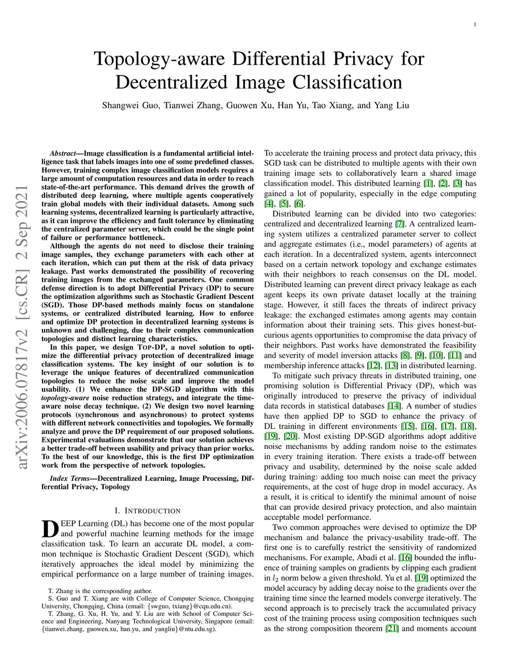 In this paper, we design Top-DP, a novel solution to optimize the differential privacy protection of decentralized image classification systems. The key insight of our solution is to leverage the unique features of decentralized communication topologies to reduce the noise scale and improve the model usability. (1) We enhance the DP-SGD algorithm with this topology-aware noise reduction strategy, and integrate the time-aware noise decay technique. (2) We design two novel learning protocols (synchronous and asynchronous) to protect systems with different network connectivities and topologies. We formally analyze and prove the DP requirement of our proposed solutions. Experimental evaluations demonstrate that our solution achieves a better trade-off between usability and privacy than prior works. To the best of our knowledge, this is the first DP optimization work from the perspective of network topologies.