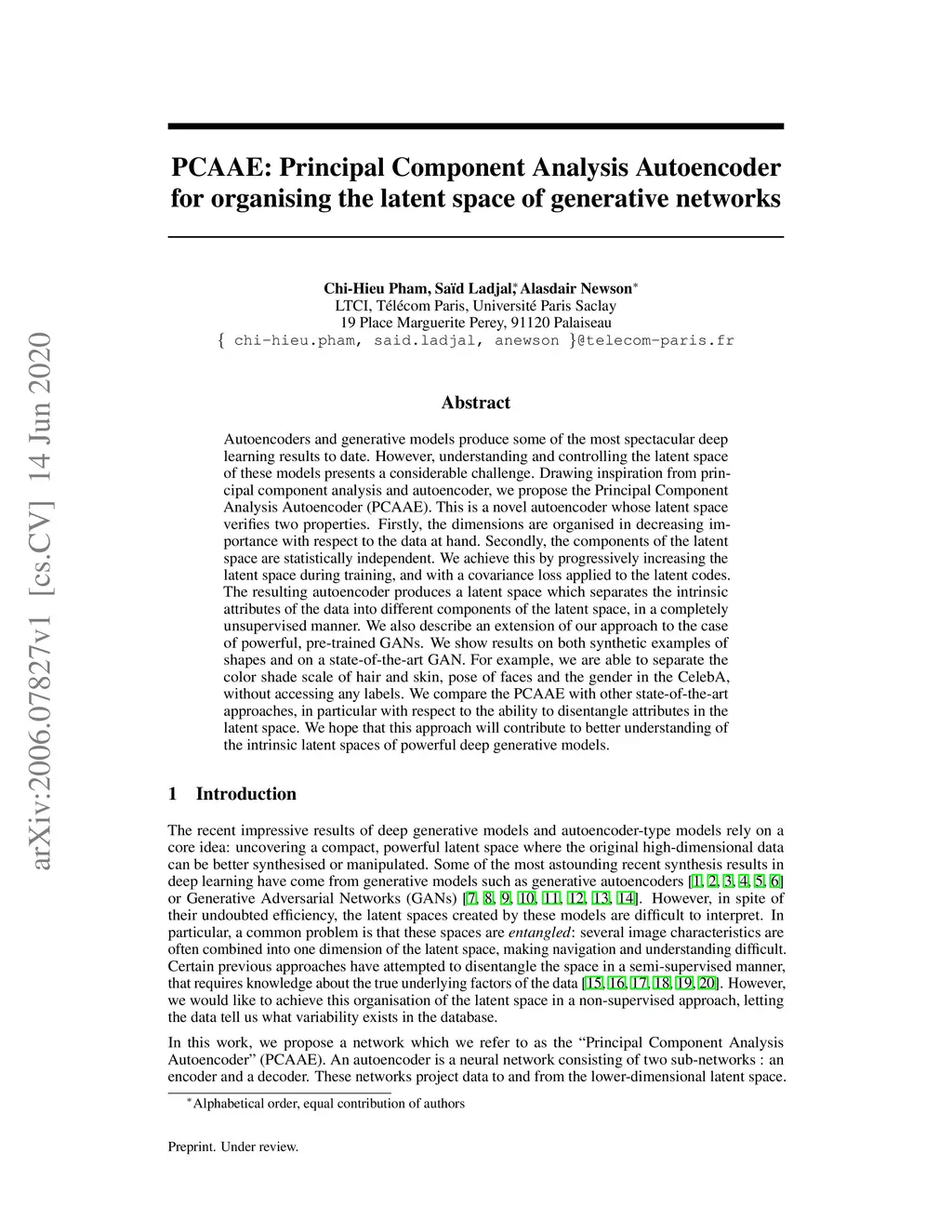 Autoencoders and generative models produce some of the most spectacular deep learning results to date. However, understanding and controlling the latent space of these models presents a considerable challenge. Drawing inspiration from principal component analysis and autoencoder, we propose the Principal Component Analysis Autoencoder (PCAAE). This is a novel autoencoder whose latent space verifies two properties. Firstly, the dimensions are organised in decreasing importance with respect to the data at hand. Secondly, the components of the latent space are statistically independent. We achieve this by progressively increasing the latent space during training, and with a covariance loss applied to the latent codes. The resulting autoencoder produces a latent space which separates the intrinsic attributes of the data into different components of the latent space, in a completely unsupervised manner. We also describe an extension of our approach to the case of powerful, pre-trained GANs. We show results on both synthetic examples of shapes and on a state-of-the-art GAN. For example, we are able to separate the color shade scale of hair and skin, pose of faces and the gender in the CelebA, without accessing any labels. We compare the PCAAE with other state-of-the-art approaches, in particular with respect to the ability to disentangle attributes in the latent space. We hope that this approach will contribute to better understanding of the intrinsic latent spaces of powerful deep generative models.