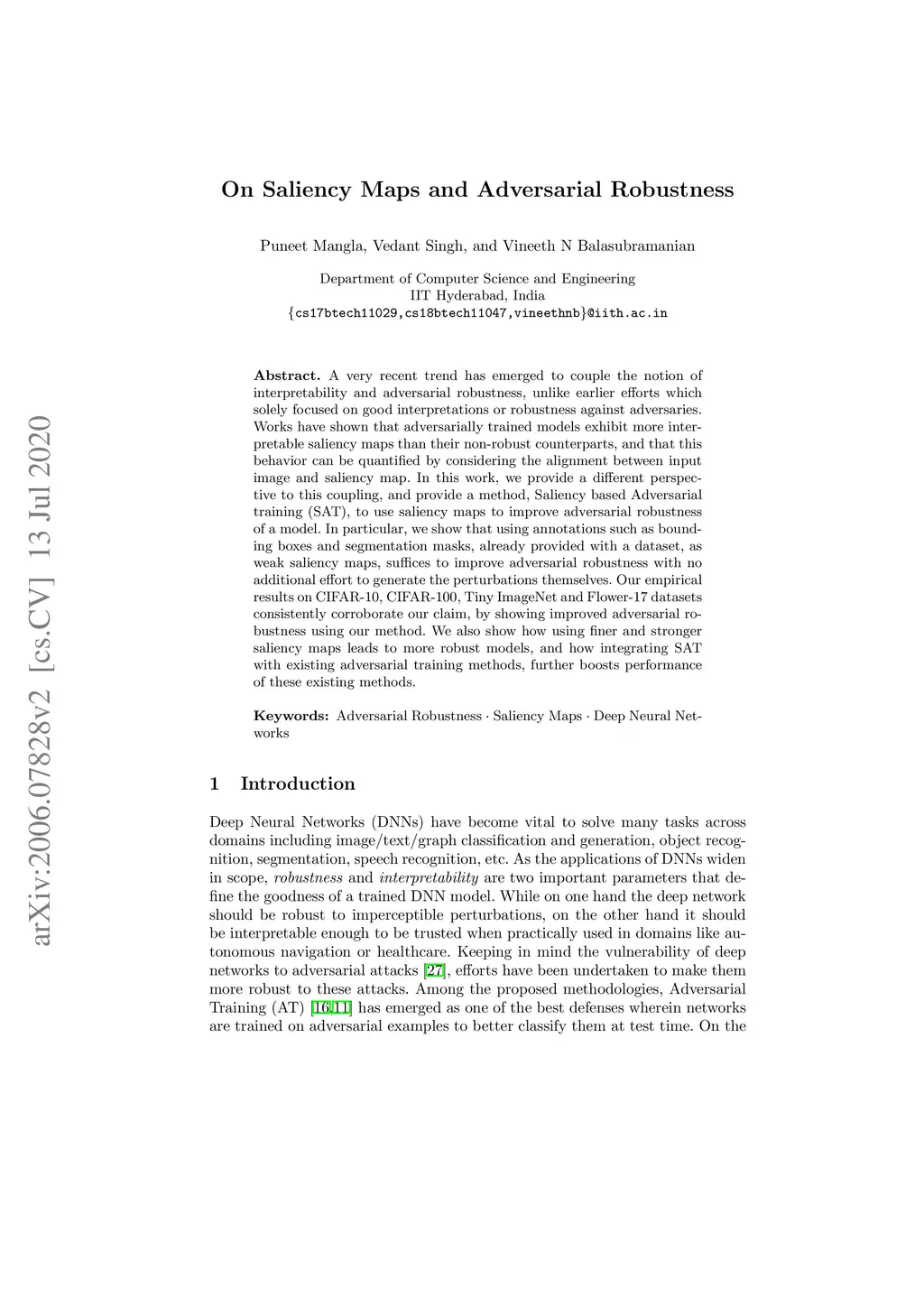 A Very recent trend has emerged to couple the notion of interpretability and adversarial robustness, unlike earlier efforts which solely focused on good interpretations or robustness against adversaries. Works have shown that adversarially trained models exhibit more interpretable saliency maps than their non-robust counterparts, and that this behavior can be quantified by considering the alignment between input image and saliency map. In this work, we provide a different perspective to this coupling, and provide a method, Saliency based Adversarial training (SAT), to use saliency maps to improve adversarial robustness of a model. In particular, we show that using annotations such as bounding boxes and segmentation masks, already provided with a dataset, as weak saliency maps, suffices to improve adversarial robustness with no additional effort to generate the perturbations themselves. Our empirical results on CIFAR-10, CIFAR-100, Tiny ImageNet and Flower-17 datasets consistently corroborate our claim, by showing improved adversarial robustness using our method. saliency maps. We also show how using finer and stronger saliency maps leads to more robust models, and how integrating SAT with existing adversarial training methods, further boosts performance of these existing methods.