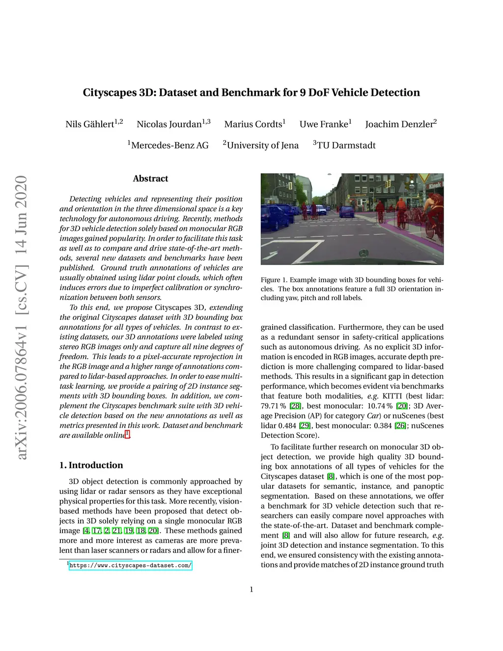 Cityscapes 3D: Dataset and Benchmark for 9 DoF Vehicle Detection
