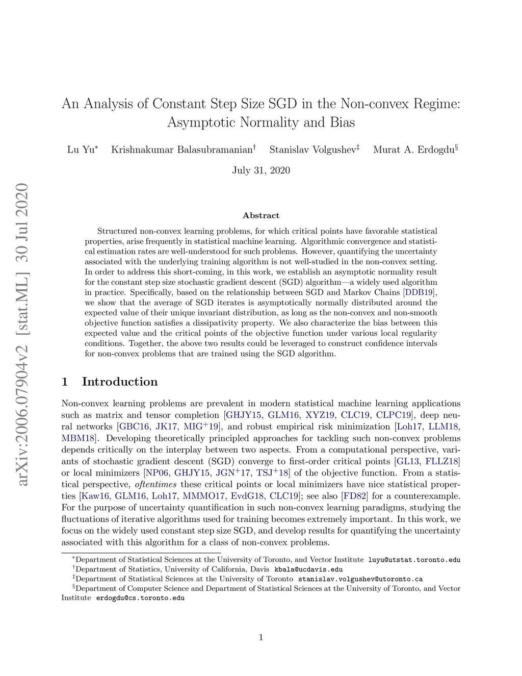 Structured non-convex learning problems, for which critical points have favorable statistical properties, arise frequently in statistical machine learning. Algorithmic convergence and statistical estimation rates are well-understood for such problems. However, quantifying the uncertainty associated with the underlying training algorithm is not well-studied in the non-convex setting. In order to address this shortcoming, in this work, we establish an asymptotic normality result for the constant step size stochastic gradient descent (SGD) algorithm--a widely used algorithm in practice. Specifically, based on the relationship between SGD and Markov Chains [DDB19], we show that the average of SGD iterates is asymptotically normally distributed around the expected value of their unique invariant distribution, as long as the non-convex and non-smooth objective function satisfies a dissipativity property. We also characterize the bias between this expected value and the critical points of the objective function under various local regularity conditions. Together, the above two results could be leveraged to construct confidence intervals for non-convex problems that are trained using the SGD algorithm.