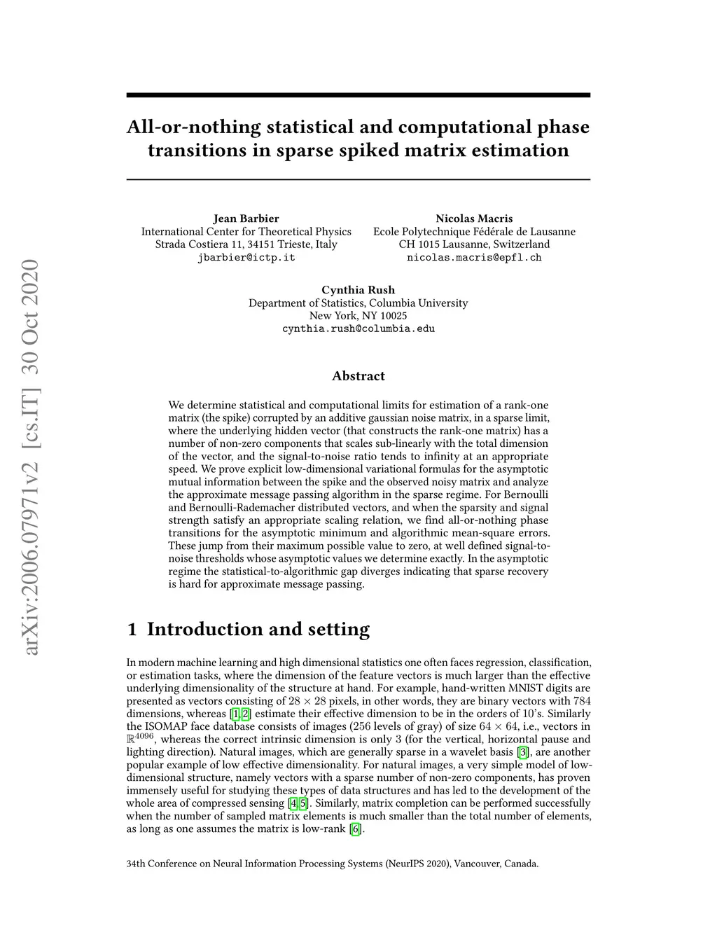 We determine statistical and computational limits for estimation of a rank-one matrix (the spike) corrupted by an additive gaussian noise matrix, in a sparse limit, where the underlying hidden vector (that constructs the rank-one matrix) has a number of non-zero components that scales sub-linearly with the total dimension of the vector, and the signal-to-noise ratio tends to infinity at an appropriate speed. We prove explicit low-dimensional variational formulas for the asymptotic mutual information between the spike and the observed noisy matrix and analyze the approximate message passing algorithm in the sparse regime. For Bernoulli and Bernoulli-Rademacher distributed vectors, and when the sparsity and signal strength satisfy an appropriate scaling relation, we find all-or-nothing phase transitions for the asymptotic minimum and algorithmic mean-square errors. These jump from their maximum possible value to zero, at well defined signal-to-noise thresholds whose asymptotic values we determine exactly. In the asymptotic regime the statistical-to-algorithmic gap diverges indicating that sparse recovery is hard for approximate message passing.