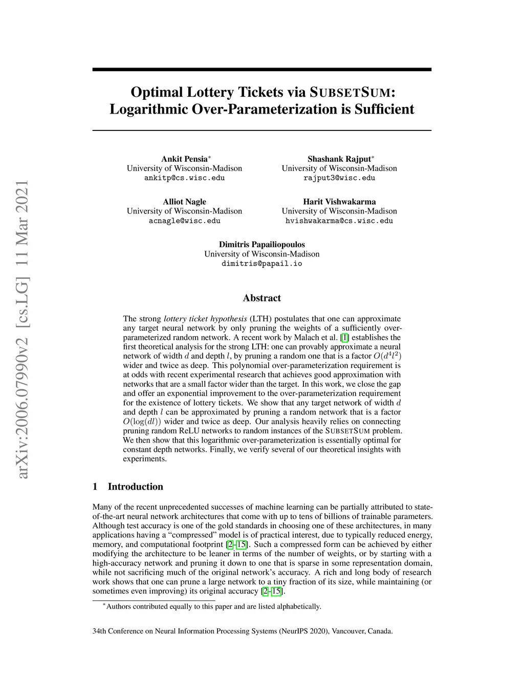Optimal Lottery Tickets via SubsetSum: Logarithmic Over-Parameterization