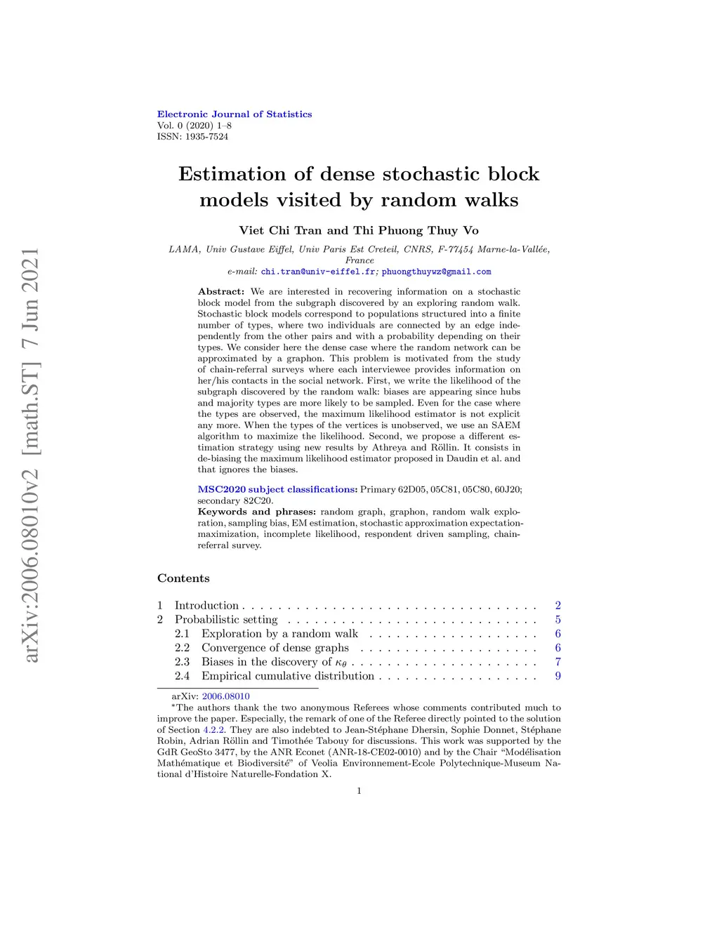We are interested in recovering information on a stochastic block model from the subgraph discovered by an exploring random walk. Stochastic block models correspond to populations structured into a finite number of types, where two individuals are connected by an edge independently from the other pairs and with a probability depending on their types. We consider here the dense case where the random network can be approximated by a graphon. This problem is motivated from the study of chain-referral surveys where each interviewee provides information on her/his contacts in the social network. First, we write the likelihood of the subgraph discovered by the random walk: biases are appearing since hubs and majority types are more likely to be sampled. Even for the case where the types are observed, the maximum likelihood estimator is not explicit any more. When the types of the vertices is unobserved, we use an SAEM algorithm to maximize the likelihood. Second, we propose a different estimation strategy using new results by Athreya and Roellin. It consists in de-biasing the maximum likelihood estimator proposed in Daudin et al. and that ignores the biases.