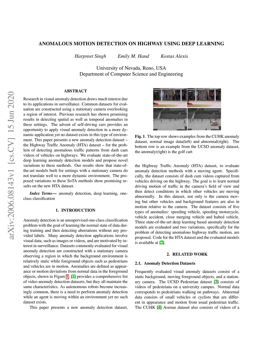 Research in visual anomaly detection draws much interest due to its applications in surveillance. Common datasets for evaluation are constructed using a stationary camera overlooking a region of interest. Previous research has shown promising results in detecting spatial as well as temporal anomalies in these settings. The advent of self-driving cars provides an opportunity to apply visual anomaly detection in a more dynamic application yet no dataset exists in this type of environment. This paper presents a new anomaly detection dataset - the Highway Traffic Anomaly (HTA) dataset - for the problem of detecting anomalous traffic patterns from dash cam videos of vehicles on highways. We evaluate state-of-the-art deep learning anomaly detection models and propose novel variations to these methods. Our results show that state-of-the-art models built for settings with a stationary camera do not translate well to a more dynamic environment. The proposed variations to these SoTA methods show promising results on the new HTA dataset.