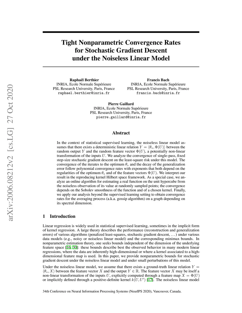 In the context of statistical supervised learning, the noiseless linear model assumes that there exists a deterministic linear relation between the random output and the random feature vector , a potentially non-linear transformation of the inputs . We analyze the convergence of single-pass, fixed step-size stochastic gradient descent on the least-square risk under this model. The convergence of the iterates to the optimum and the decay of the generalization error follow polynomial convergence rates with exponents that both depend on the regularities of the optimum and of the feature vectors . We interpret our result in the reproducing kernel Hilbert space framework. As a special case, we analyze an online algorithm for estimating a real function on the unit interval from the noiseless observation of its value at randomly sampled points; the convergence depends on the Sobolev smoothness of the function and of a chosen kernel. Finally, we apply our analysis beyond the supervised learning setting to obtain convergence rates for the averaging process (a.k.a. gossip algorithm) on a graph depending on its spectral dimension.