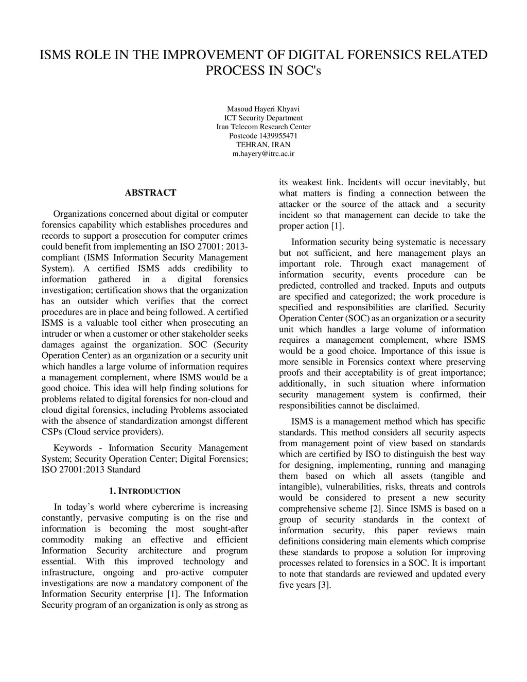 Organizations concerned about digital or computer forensics capability which establishes procedures and records to support a prosecution for computer crimes could benefit from implementing an ISO 27001: 2013-compliant (ISMS Information Security Management System). A certified ISMS adds credibility to information gathered in a digital forensics investigation; certification shows that the organization has an outsider which verifies that the correct procedures are in place and being followed. A certified ISMS is a valuable tool either when prosecuting an intruder or when a customer or other stakeholder seeks damages against the organization. SOC (Security Operation Center) as an organization or a security unit which handles a large volume of information requires a management complement, where ISMS would be a good choice. This idea will help finding solutions for problems related to digital forensics for non-cloud and cloud digital forensics, including Problems associated with the absence of standardization amongst different CSPs (Cloud service providers).