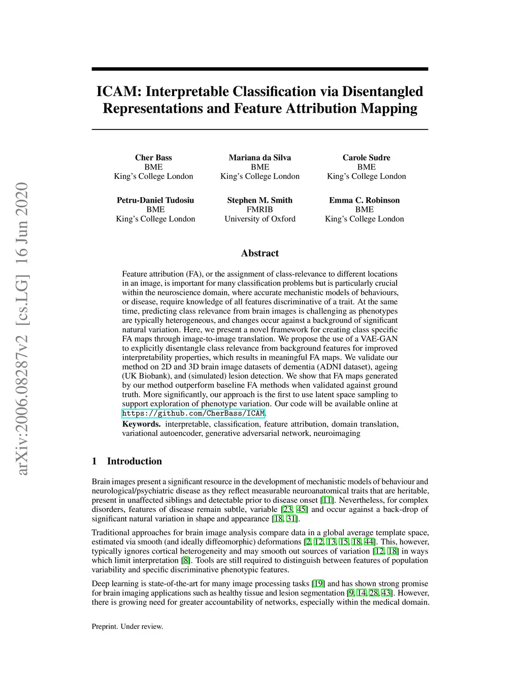 Feature attribution (FA), or the assignment of class-relevance to different locations in an image, is important for many classification problems but is particularly crucial within the neuroscience domain, where accurate mechanistic models of behaviours, or disease, require knowledge of all features discriminative of a trait. At the same time, predicting class relevance from brain images is challenging as phenotypes are typically heterogeneous, and changes occur against a background of significant natural variation. Here, we present a novel framework for creating class specific FA maps through image-to-image translation. We propose the use of a VAE-GAN to explicitly disentangle class relevance from background features for improved interpretability properties, which results in meaningful FA maps. We validate our method on 2D and 3D brain image datasets of dementia (ADNI dataset), ageing (UK Biobank), and (simulated) lesion detection. We show that FA maps generated by our method outperform baseline FA methods when validated against ground truth. More significantly, our approach is the first to use latent space sampling to support exploration of phenotype variation. Our code will be available online at https://github.com/CherBass/ICAM.