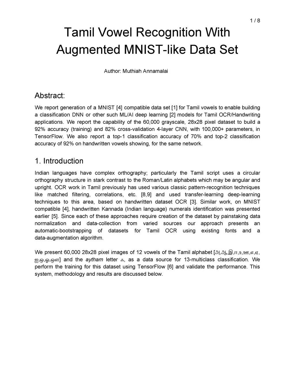 Tamil Vowel Recognition With Augmented MNIST-like Data Set