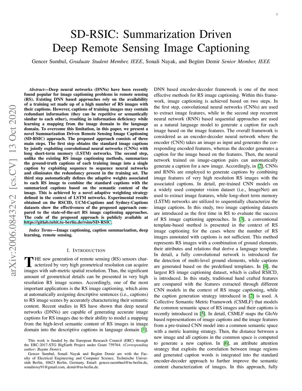 SD-RSIC: Summarization Driven Deep Remote Sensing Image Captioning