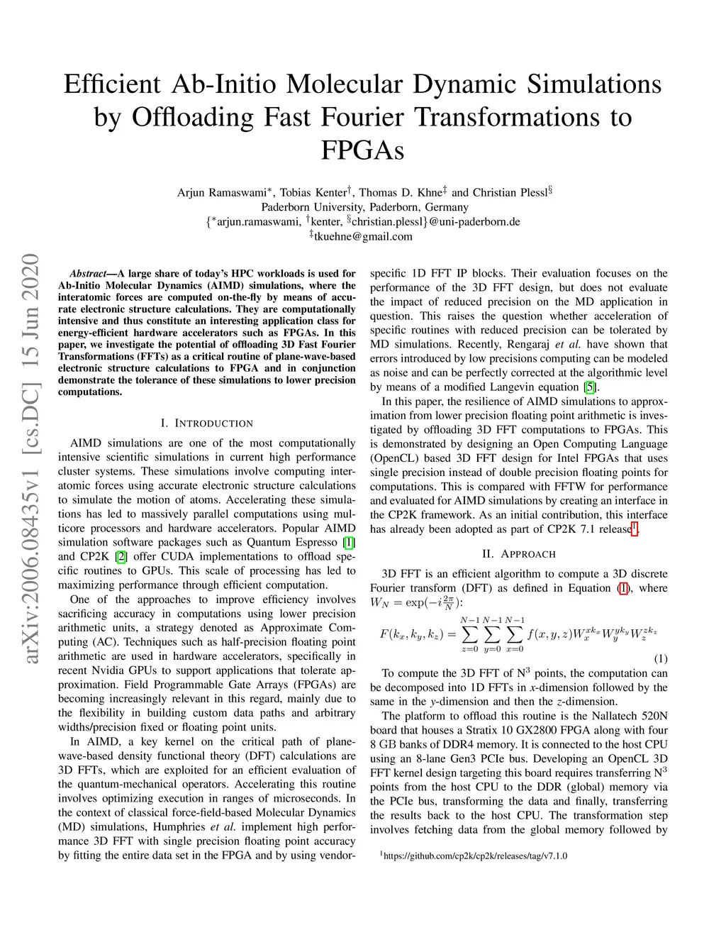 A large share of today's HPC workloads is used for Ab-Initio Molecular Dynamics (AIMD) simulations, where the interatomic forces are computed on-the-fly by means of accurate electronic structure calculations. They are computationally intensive and thus constitute an interesting application class for energy-efficient hardware accelerators such as FPGAs. In this paper, we investigate the potential of offloading 3D Fast Fourier Transformations (FFTs) as a critical routine of plane-wave-based electronic structure calculations to FPGA and in conjunction demonstrate the tolerance of these simulations to lower precision computations.