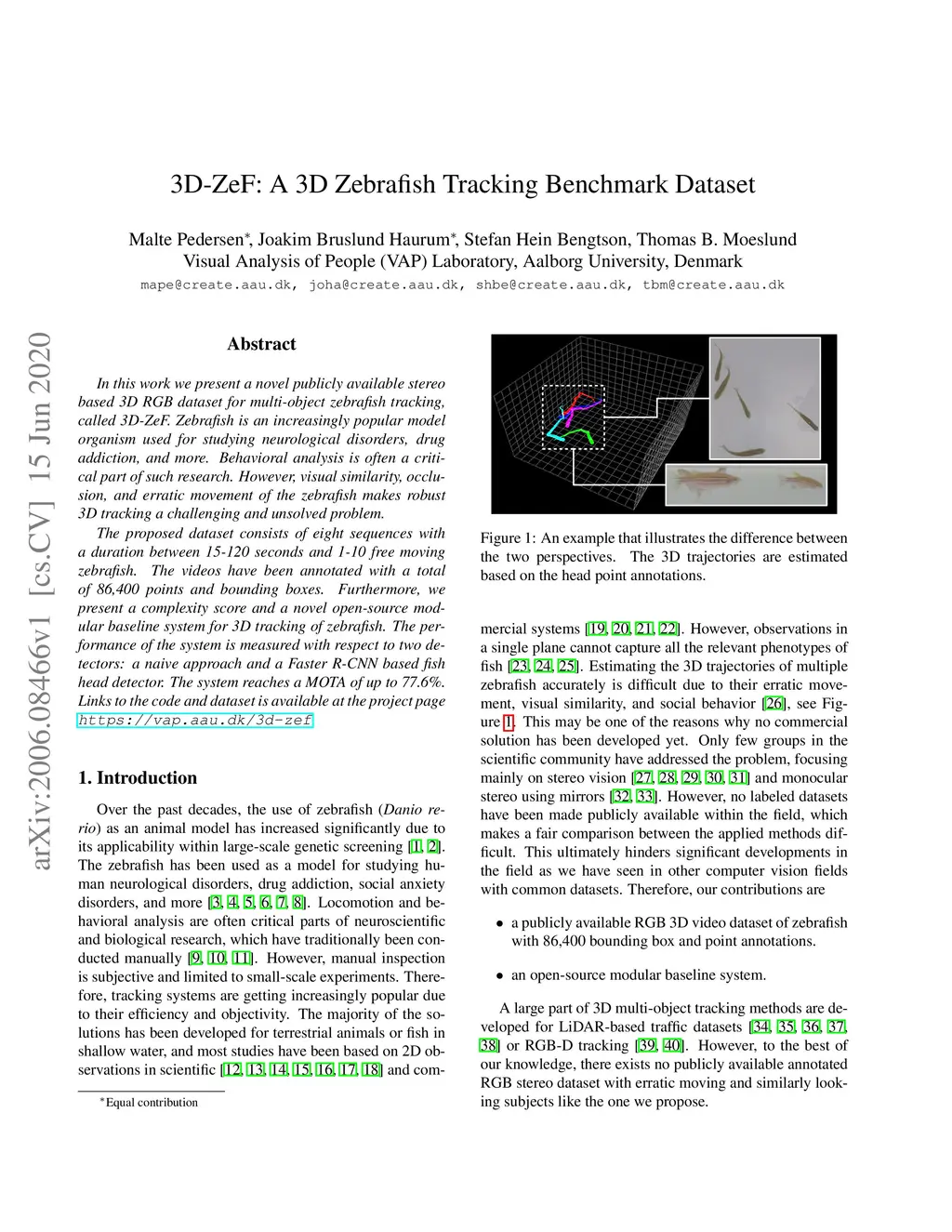 In this work we present a novel publicly available stereo based 3D RGB dataset for multi-object zebrafish tracking, called 3D-ZeF. Zebrafish is an increasingly popular model organism used for studying neurological disorders, drug addiction, and more. Behavioral analysis is often a critical part of such research. However, visual similarity, occlusion, and erratic movement of the zebrafish makes robust 3D tracking a challenging and unsolved problem. The proposed dataset consists of eight sequences with a duration between 15-120 seconds and 1-10 free moving zebrafish. The videos have been annotated with a total of 86,400 points and bounding boxes. Furthermore, we present a complexity score and a novel open-source modular baseline system for 3D tracking of zebrafish. The performance of the system is measured with respect to two detectors: a naive approach and a Faster R-CNN based fish head detector. The system reaches a MOTA of up to 77.6%. Links to the code and dataset is available at the project page https://vap.aau.dk/3d-zef