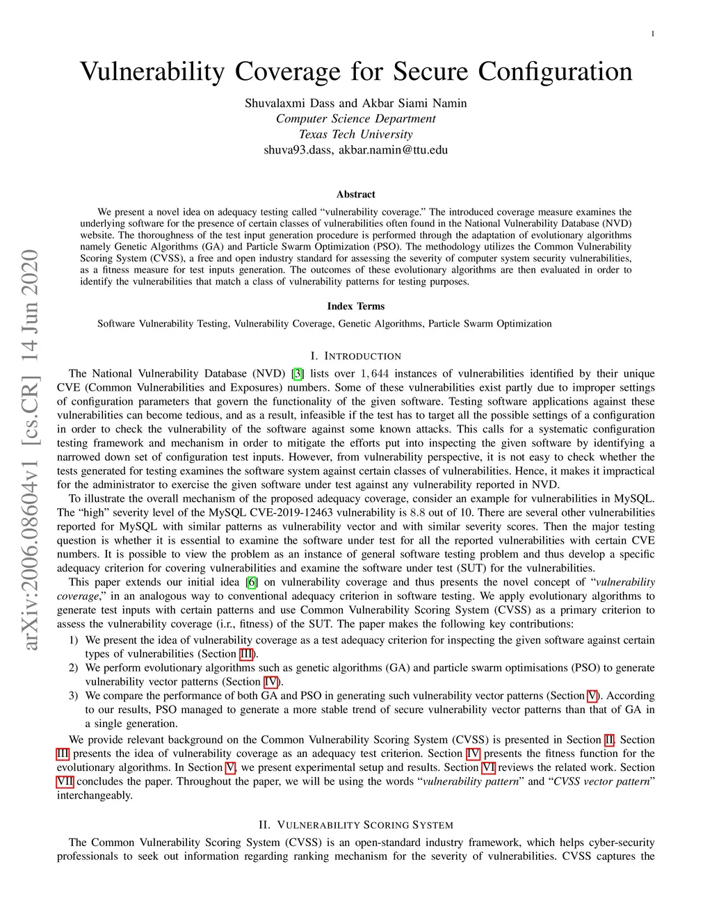 We present a novel idea on adequacy testing called ``{vulnerability coverage}.'' The introduced coverage measure examines the underlying software for the presence of certain classes of vulnerabilities often found in the National Vulnerability Database (NVD) website. The thoroughness of the test input generation procedure is performed through the adaptation of evolutionary algorithms namely Genetic Algorithms (GA) and Particle Swarm Optimization (PSO). The methodology utilizes the Common Vulnerability Scoring System (CVSS), a free and open industry standard for assessing the severity of computer system security vulnerabilities, as a fitness measure for test inputs generation. The outcomes of these evolutionary algorithms are then evaluated in order to identify the vulnerabilities that match a class of vulnerability patterns for testing purposes.