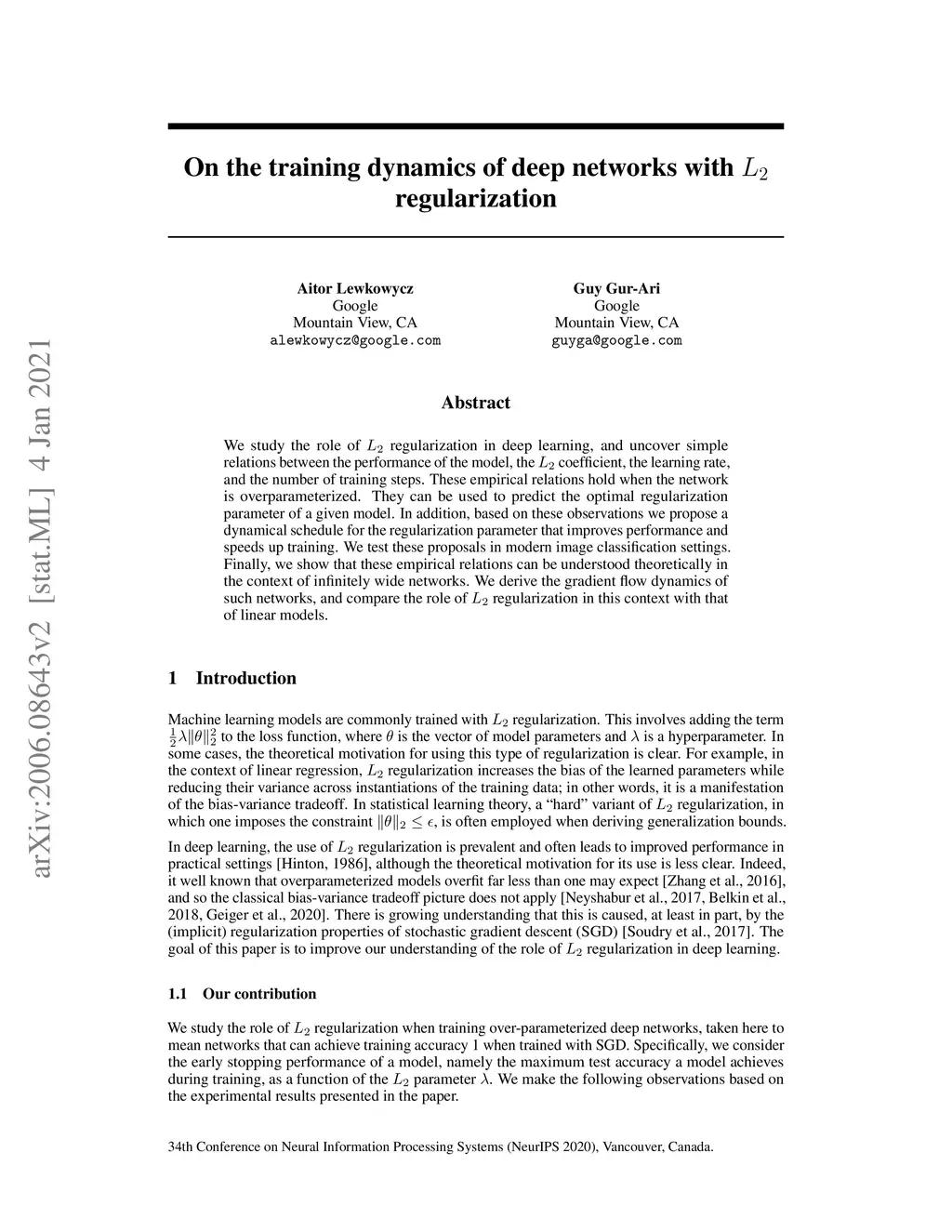 We study the role of regularization in deep learning, and uncover simple relations between the performance of the model, the coefficient, the learning rate, and the number of training steps. These empirical relations hold when the network is overparameterized. They can be used to predict the optimal regularization parameter of a given model. In addition, based on these observations we propose a dynamical schedule for the regularization parameter that improves performance and speeds up training. We test these proposals in modern image classification settings. Finally, we show that these empirical relations can be understood theoretically in the context of infinitely wide networks. We derive the gradient flow dynamics of such networks, and compare the role of regularization in this context with that of linear models.
