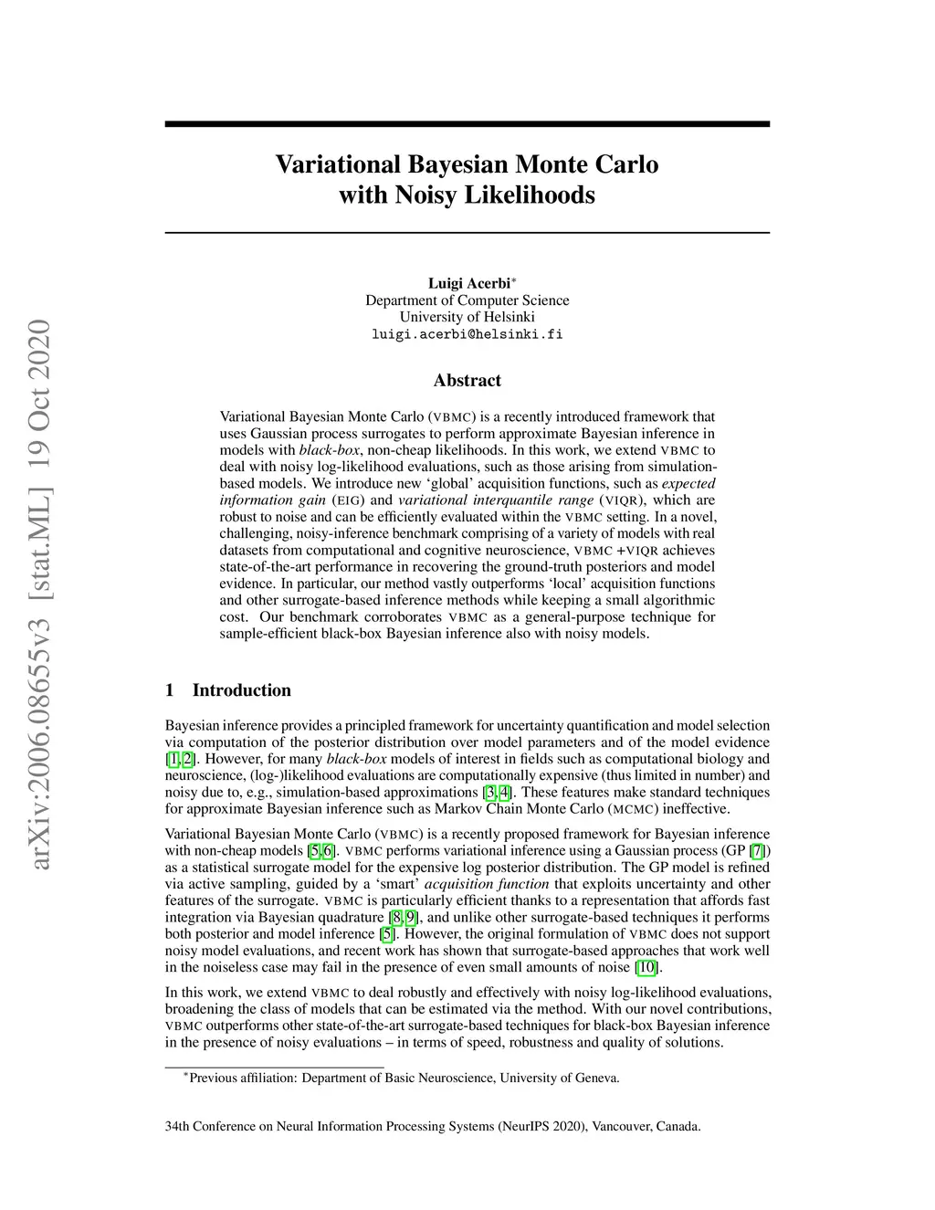 Variational Bayesian Monte Carlo with Noisy Likelihoods