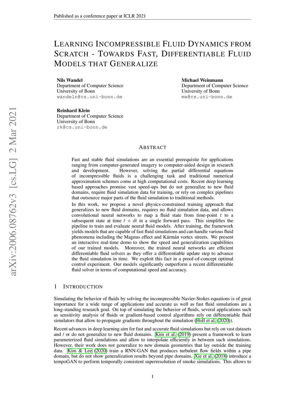 Fast and stable fluid simulations are an essential prerequisite for applications ranging from computer-generated imagery to computer-aided design in research and development. However, solving the partial differential equations of incompressible fluids is a challenging task and traditional numerical approximation schemes come at high computational costs. Recent deep learning based approaches promise vast speed-ups but do not generalize to new fluid domains, require fluid simulation data for training, or rely on complex pipelines that outsource major parts of the fluid simulation to traditional methods. In this work, we propose a novel physics-constrained training approach that generalizes to new fluid domains, requires no fluid simulation data, and allows convolutional neural networks to map a fluid state from time-point t to a subsequent state at time t + dt in a single forward pass. This simplifies the pipeline to train and evaluate neural fluid models. After training, the framework yields models that are capable of fast fluid simulations and can handle various fluid phenomena including the Magnus effect and Karman vortex streets. We present an interactive real-time demo to show the speed and generalization capabilities of our trained models. Moreover, the trained neural networks are efficient differentiable fluid solvers as they offer a differentiable update step to advance the fluid simulation in time. We exploit this fact in a proof-of-concept optimal control experiment. Our models significantly outperform a recent differentiable fluid solver in terms of computational speed and accuracy.