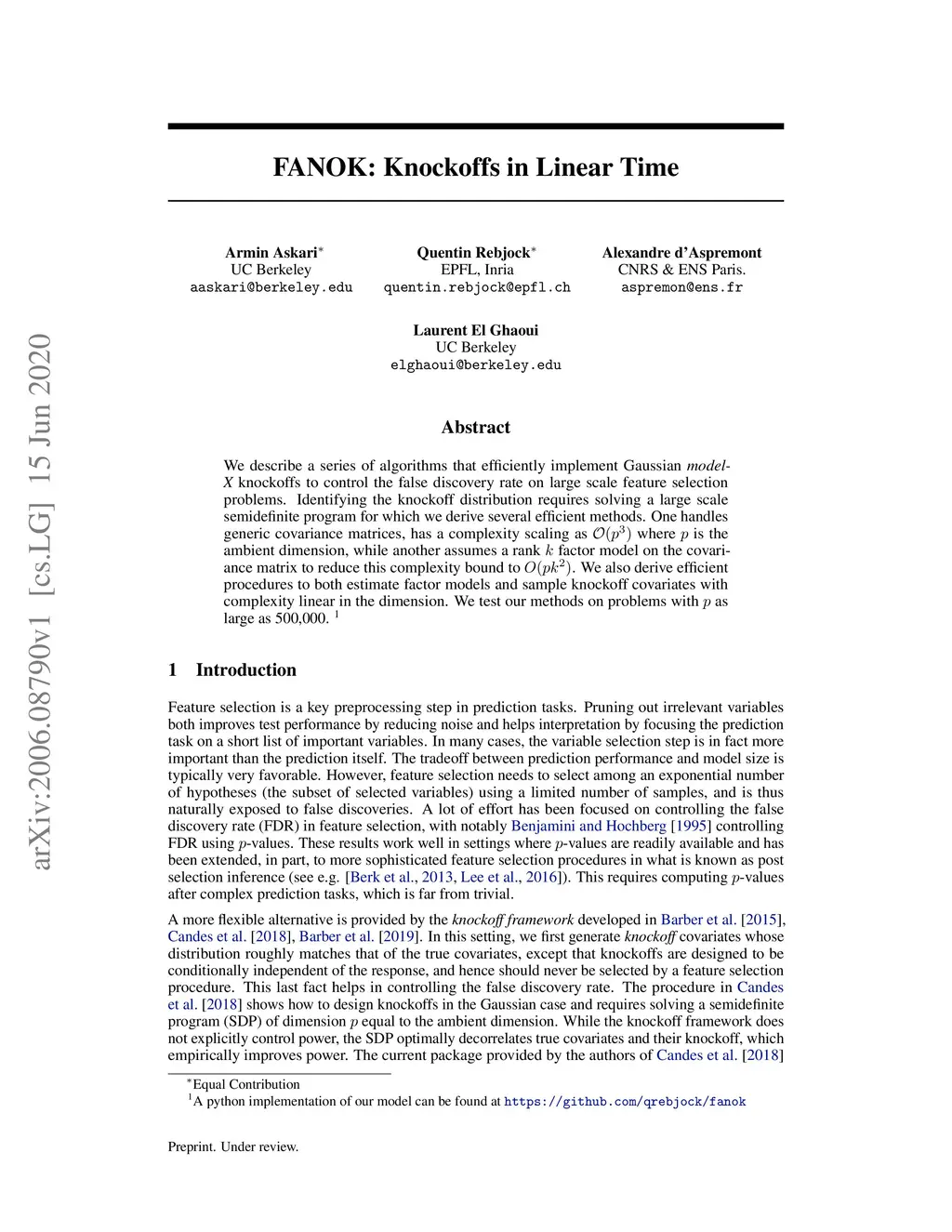 We describe a series of algorithms that efficiently implement Gaussian model-X knockoffs to control the false discovery rate on large scale feature selection problems. Identifying the knockoff distribution requires solving a large scale semidefinite program for which we derive several efficient methods. One handles generic covariance matrices, has a complexity scaling as where is the ambient dimension, while another assumes a rank factor model on the covariance matrix to reduce this complexity bound to . We also derive efficient procedures to both estimate factor models and sample knockoff covariates with complexity linear in the dimension. We test our methods on problems with as large as .