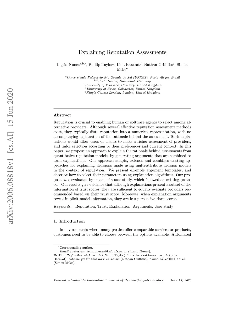 Reputation is crucial to enabling human or software agents to select among alternative providers. Although several effective reputation assessment methods exist, they typically distil reputation into a numerical representation, with no accompanying explanation of the rationale behind the assessment. Such explanations would allow users or clients to make a richer assessment of providers, and tailor selection according to their preferences and current context. In this paper, we propose an approach to explain the rationale behind assessments from quantitative reputation models, by generating arguments that are combined to form explanations. Our approach adapts, extends and combines existing approaches for explaining decisions made using multi-attribute decision models in the context of reputation. We present example argument templates, and describe how to select their parameters using explanation algorithms. Our proposal was evaluated by means of a user study, which followed an existing protocol. Our results give evidence that although explanations present a subset of the information of trust scores, they are sufficient to equally evaluate providers recommended based on their trust score. Moreover, when explanation arguments reveal implicit model information, they are less persuasive than scores.