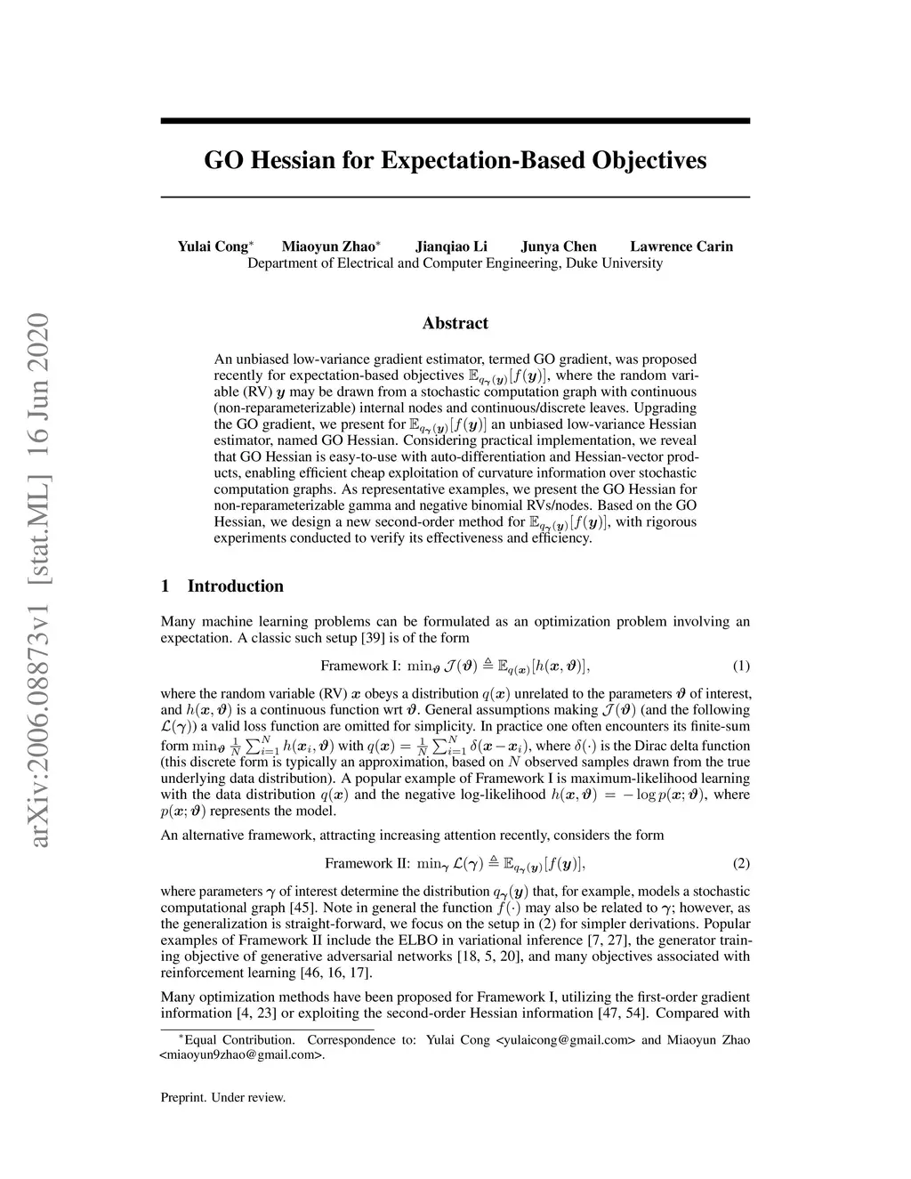 An unbiased low-variance gradient estimator, termed GO gradient, was proposed recently for expectation-based objectives , where the random variable (RV) may be drawn from a stochastic computation graph with continuous (non-reparameterizable) internal nodes and continuous/discrete leaves. Upgrading the GO gradient, we present for an unbiased low-variance Hessian estimator, named GO Hessian. Considering practical implementation, we reveal that GO Hessian is easy-to-use with auto-differentiation and Hessian-vector products, enabling efficient cheap exploitation of curvature information over stochastic computation graphs. As representative examples, we present the GO Hessian for non-reparameterizable gamma and negative binomial RVs/nodes. Based on the GO Hessian, we design a new second-order method for , with rigorous experiments conducted to verify its effectiveness and efficiency.