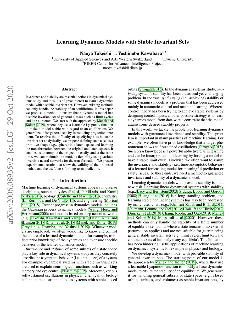 Invariance and stability are essential notions in dynamical systems study, and thus it is of great interest to learn a dynamics model with a stable invariant set. However, existing methods can only handle the stability of an equilibrium. In this paper, we propose a method to ensure that a dynamics model has a stable invariant set of general classes such as limit cycles and line attractors. We start with the approach by Manek and Kolter (2019), where they use a learnable Lyapunov function to make a model stable with regard to an equilibrium. We generalize it for general sets by introducing projection onto them. To resolve the difficulty of specifying a to-be stable invariant set analytically, we propose defining such a set as a primitive shape (e.g., sphere) in a latent space and learning the transformation between the original and latent spaces. It enables us to compute the projection easily, and at the same time, we can maintain the model's flexibility using various invertible neural networks for the transformation. We present experimental results that show the validity of the proposed method and the usefulness for long-term prediction.