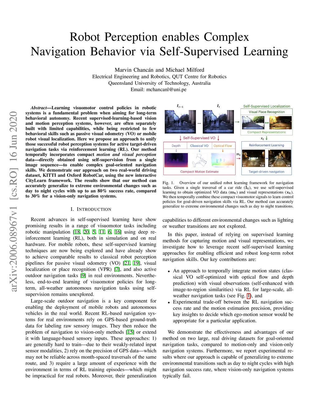 Learning visuomotor control policies in robotic systems is a fundamental problem when aiming for long-term behavioral autonomy. Recent supervised-learning-based vision and motion perception systems, however, are often separately built with limited capabilities, while being restricted to few behavioral skills such as passive visual odometry (VO) or mobile robot visual localization. Here we propose an approach to unify those successful robot perception systems for active target-driven navigation tasks via reinforcement learning (RL). Our method temporally incorporates compact motion and visual perception data - directly obtained using self-supervision from a single image sequence - to enable complex goal-oriented navigation skills. We demonstrate our approach on two real-world driving dataset, KITTI and Oxford RobotCar, using the new interactive CityLearn framework. The results show that our method can accurately generalize to extreme environmental changes such as day to night cycles with up to an 80% success rate, compared to 30% for a vision-only navigation systems.