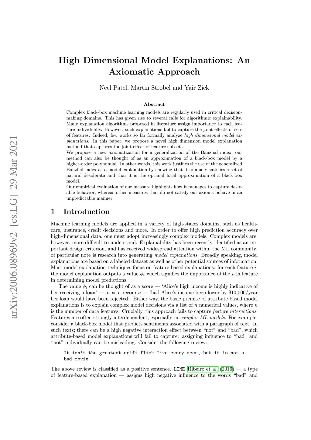 High Dimensional Model Explanations: an Axiomatic Approach