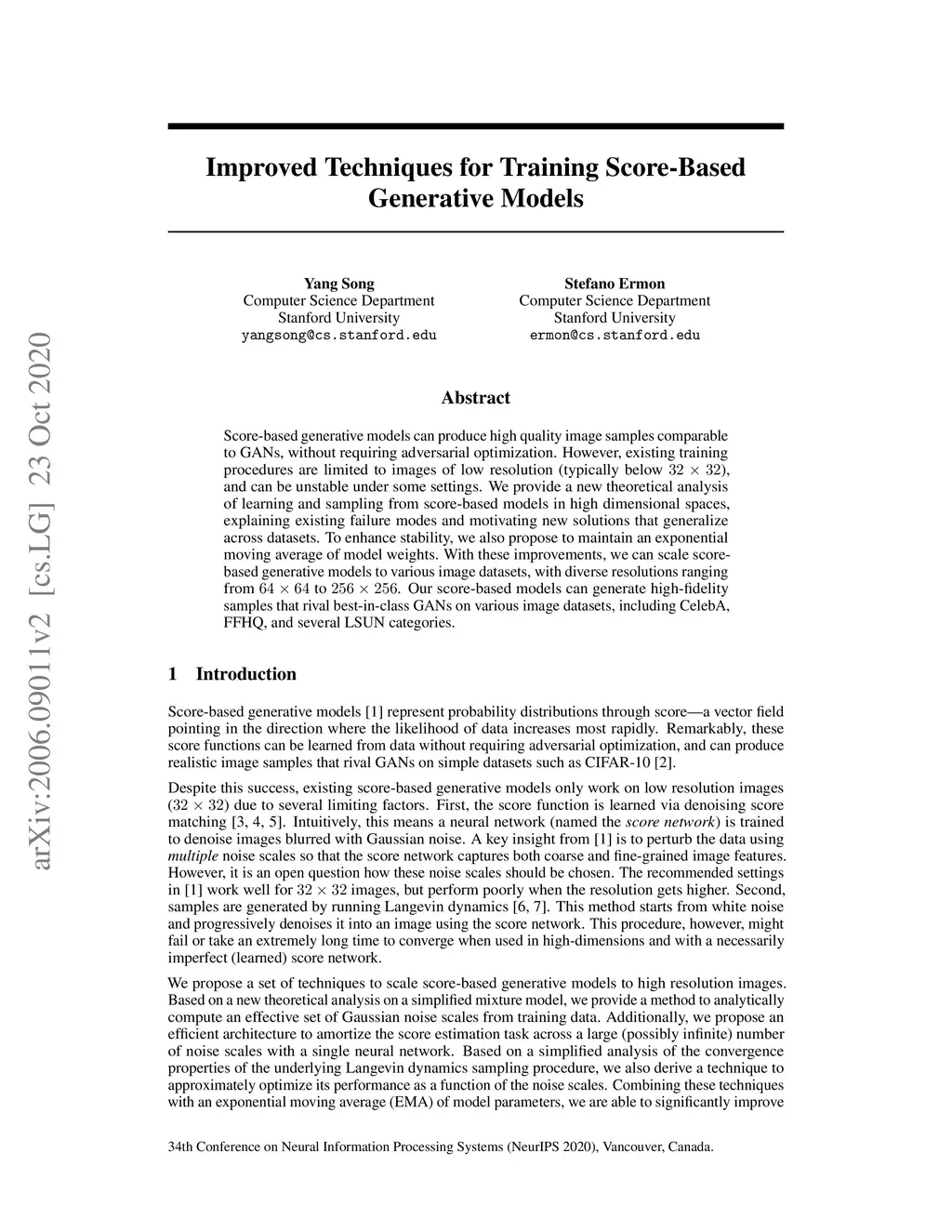 Score-based generative models can produce high quality image samples comparable to GANs, without requiring adversarial optimization. However, existing training procedures are limited to images of low resolution (typically below 32x32), and can be unstable under some settings. We provide a new theoretical analysis of learning and sampling from score models in high dimensional spaces, explaining existing failure modes and motivating new solutions that generalize across datasets. To enhance stability, we also propose to maintain an exponential moving average of model weights. With these improvements, we can effortlessly scale score-based generative models to images with unprecedented resolutions ranging from 64x64 to 256x256. Our score-based models can generate high-fidelity samples that rival best-in-class GANs on various image datasets, including CelebA, FFHQ, and multiple LSUN categories.