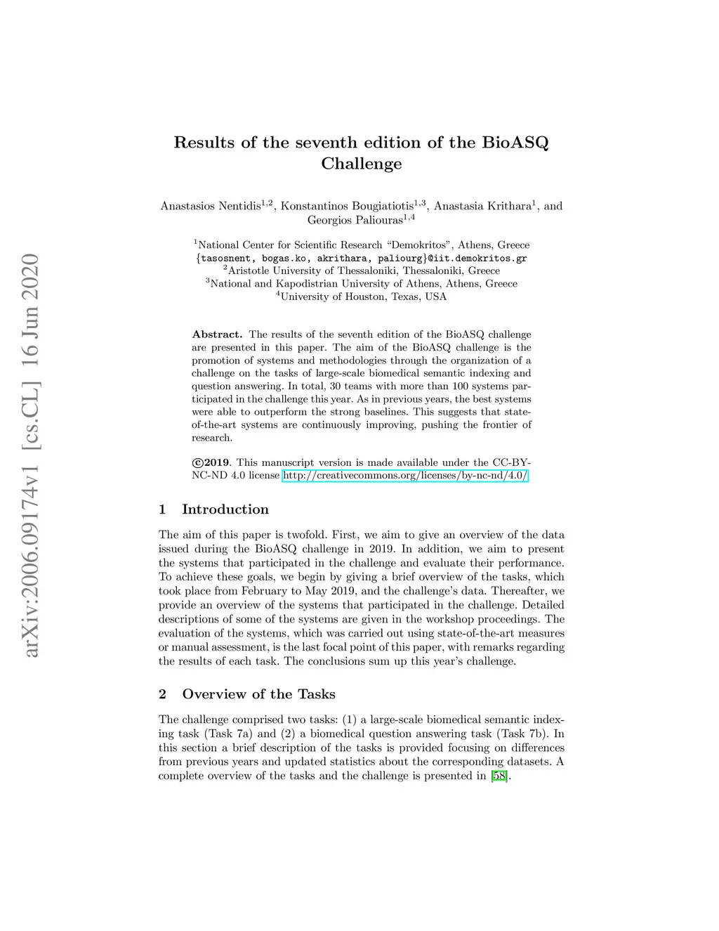 The results of the seventh edition of the BioASQ challenge are presented in this paper. The aim of the BioASQ challenge is the promotion of systems and methodologies through the organization of a challenge on the tasks of large-scale biomedical semantic indexing and question answering. In total, 30 teams with more than 100 systems participated in the challenge this year. As in previous years, the best systems were able to outperform the strong baselines. This suggests that state-of-the-art systems are continuously improving, pushing the frontier of research.
