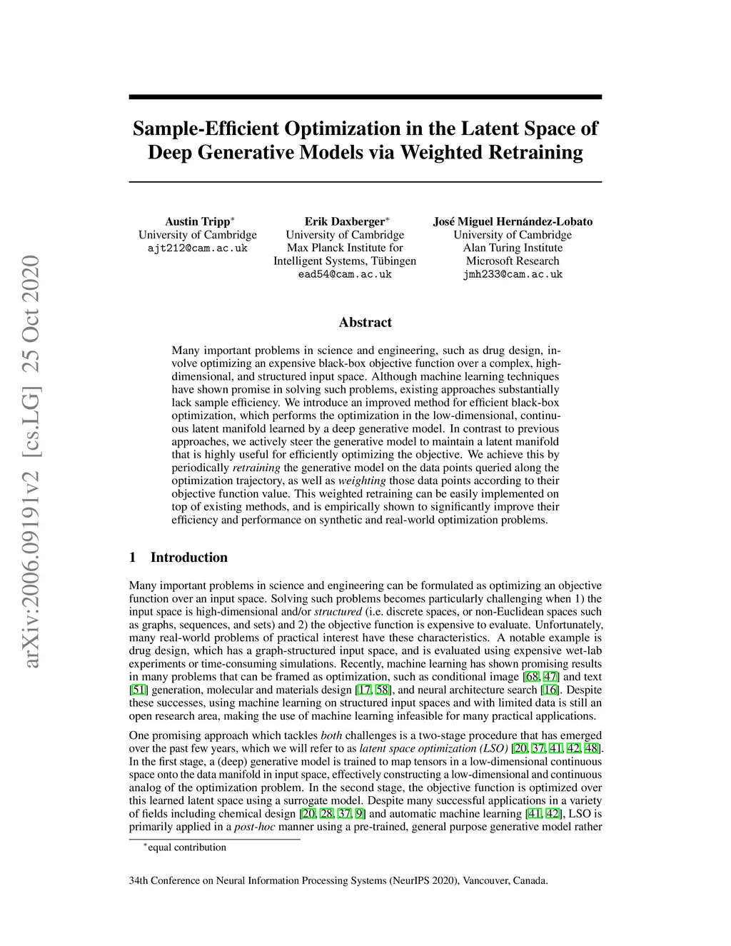 Many important problems in science and engineering, such as drug design, involve optimizing an expensive black-box objective function over a complex, high-dimensional, and structured input space. Although machine learning techniques have shown promise in solving such problems, existing approaches substantially lack sample efficiency. We introduce an improved method for efficient black-box optimization, which performs the optimization in the low-dimensional, continuous latent manifold learned by a deep generative model. In contrast to previous approaches, we actively steer the generative model to maintain a latent manifold that is highly useful for efficiently optimizing the objective. We achieve this by periodically retraining the generative model on the data points queried along the optimization trajectory, as well as weighting those data points according to their objective function value. This weighted retraining can be easily implemented on top of existing methods, and is empirically shown to significantly improve their efficiency and performance on synthetic and real-world optimization problems.