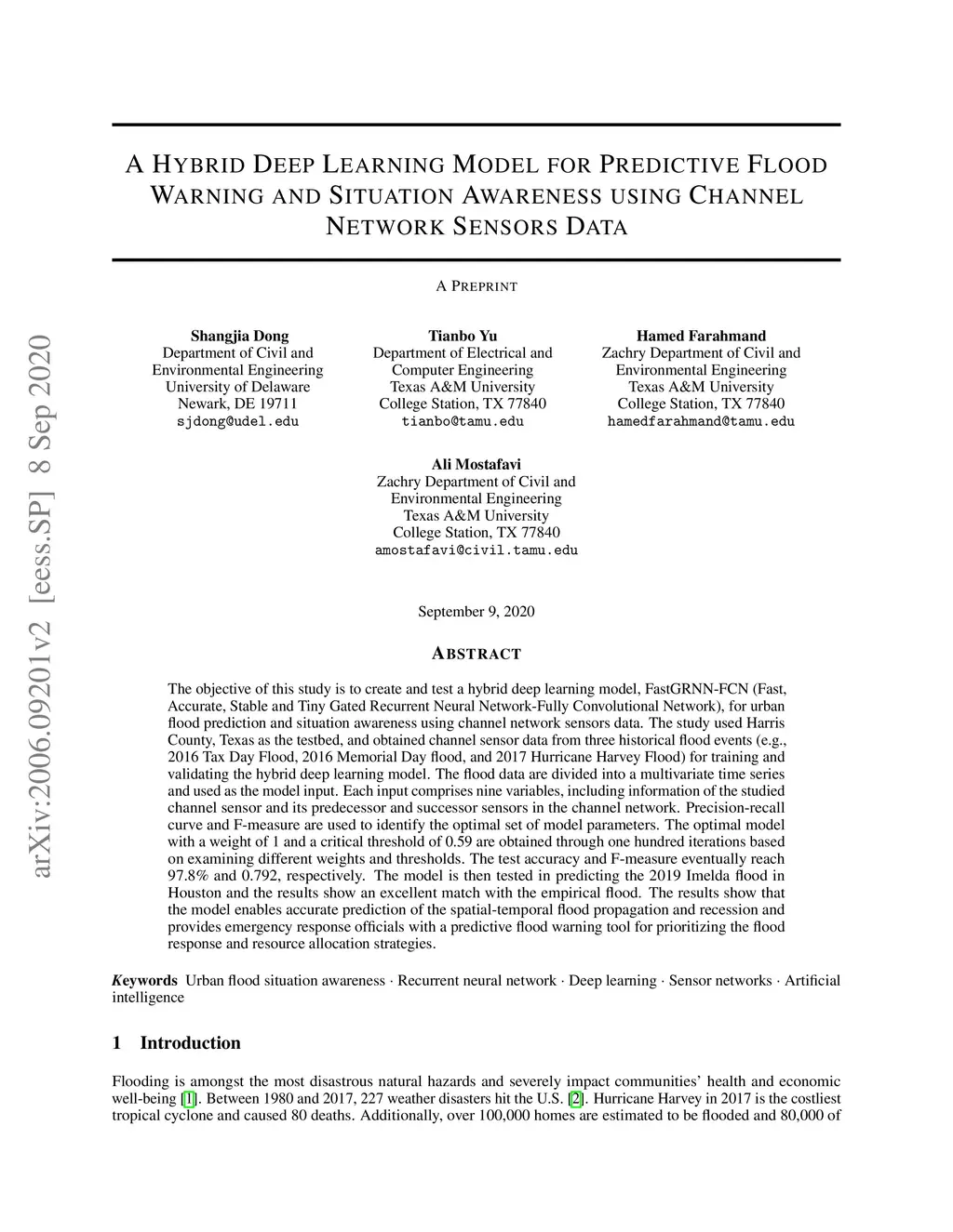 The objective of this study is to create and test a hybrid deep learning model, FastGRNN-FCN (Fast, Accurate, Stable and Tiny Gated Recurrent Neural Network-Fully Convolutional Network), for urban flood prediction and situation awareness using channel network sensors data. The study used Harris County, Texas as the testbed, and obtained channel sensor data from three historical flood events (e.g., 2016 Tax Day Flood, 2016 Memorial Day flood, and 2017 Hurricane Harvey Flood) for training and validating the hybrid deep learning model. The flood data are divided into a multivariate time series and used as the model input. Each input comprises nine variables, including information of the studied channel sensor and its predecessor and successor sensors in the channel network. Precision-recall curve and F-measure are used to identify the optimal set of model parameters. The optimal model with a weight of 1 and a critical threshold of 0.59 are obtained through one hundred iterations based on examining different weights and thresholds. The test accuracy and F-measure eventually reach 97.8% and 0.792, respectively. The model is then tested in predicting the 2019 Imelda flood in Houston and the results show an excellent match with the empirical flood. The results show that the model enables accurate prediction of the spatial-temporal flood propagation and recession and provides emergency response officials with a predictive flood warning tool for prioritizing the flood response and resource allocation strategies.