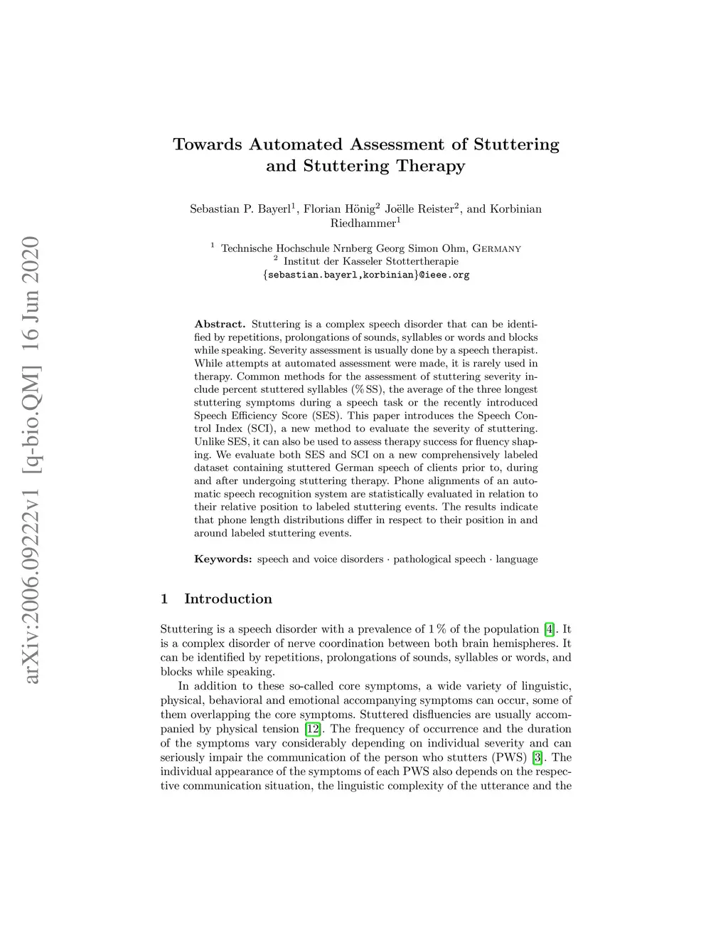 Stuttering is a complex speech disorder that can be identified by repetitions, prolongations of sounds, syllables or words, and blocks while speaking. Severity assessment is usually done by a speech therapist. While attempts at automated assessment were made, it is rarely used in therapy. Common methods for the assessment of stuttering severity include percent stuttered syllables (% SS), the average of the three longest stuttering symptoms during a speech task, or the recently introduced Speech Efficiency Score (SES). This paper introduces the Speech Control Index (SCI), a new method to evaluate the severity of stuttering. Unlike SES, it can also be used to assess therapy success for fluency shaping. We evaluate both SES and SCI on a new comprehensively labeled dataset containing stuttered German speech of clients prior to, during, and after undergoing stuttering therapy. Phone alignments of an automatic speech recognition system are statistically evaluated in relation to their relative position to labeled stuttering events. The results indicate that phone length distributions differ with respect to their position in and around labeled stuttering events