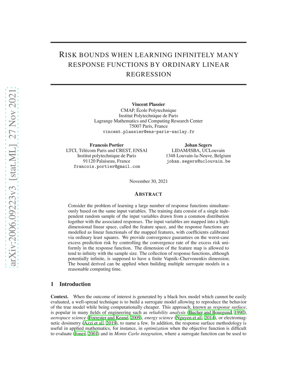 Consider the problem of learning a large number of response functions simultaneously based on the same input variables. The training data consist of a single independent random sample of the input variables drawn from a common distribution together with the associated responses. The input variables are mapped into a high-dimensional linear space, called the feature space, and the response functions are modelled as linear functionals of the mapped features, with coefficients calibrated via ordinary least squares. We provide convergence guarantees on the worst-case excess prediction risk by controlling the convergence rate of the excess risk uniformly in the response function. The dimension of the feature map is allowed to tend to infinity with the sample size. The collection of response functions, although potentially infinite, is supposed to have a finite Vapnik-Chervonenkis dimension. The bound derived can be applied when building multiple surrogate models in a reasonable computing time.