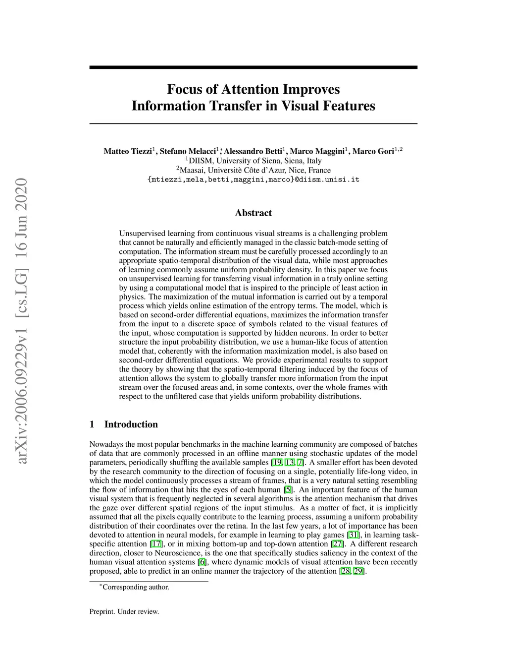 Unsupervised learning from continuous visual streams is a challenging problem that cannot be naturally and efficiently managed in the classic batch-mode setting of computation. The information stream must be carefully processed accordingly to an appropriate spatio-temporal distribution of the visual data, while most approaches of learning commonly assume uniform probability density. In this paper we focus on unsupervised learning for transferring visual information in a truly online setting by using a computational model that is inspired to the principle of least action in physics. The maximization of the mutual information is carried out by a temporal process which yields online estimation of the entropy terms. The model, which is based on second-order differential equations, maximizes the information transfer from the input to a discrete space of symbols related to the visual features of the input, whose computation is supported by hidden neurons. In order to better structure the input probability distribution, we use a human-like focus of attention model that, coherently with the information maximization model, is also based on second-order differential equations. We provide experimental results to support the theory by showing that the spatio-temporal filtering induced by the focus of attention allows the system to globally transfer more information from the input stream over the focused areas and, in some contexts, over the whole frames with respect to the unfiltered case that yields uniform probability distributions.