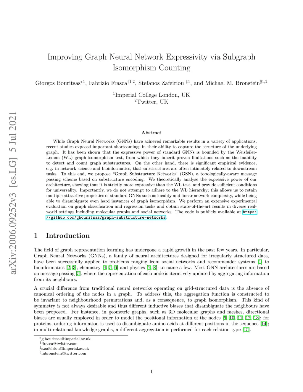 While Graph Neural Networks (GNNs) have achieved remarkable results in a variety of applications, recent studies exposed important shortcomings in their ability to capture the structure of the underlying graph. It has been shown that the expressive power of standard GNNs is bounded by the Weisfeiler-Leman (WL) graph isomorphism test, from which they inherit proven limitations such as the inability to detect and count graph substructures. On the other hand, there is significant empirical evidence, e.g. in network science and bioinformatics, that substructures are often intimately related to downstream tasks. To this end, we propose "Graph Substructure Networks" (GSN), a topologically-aware message passing scheme based on substructure encoding. We theoretically analyse the expressive power of our architecture, showing that it is strictly more expressive than the WL test, and provide sufficient conditions for universality. Importantly, we do not attempt to adhere to the WL hierarchy; this allows us to retain multiple attractive properties of standard GNNs such as locality and linear network complexity, while being able to disambiguate even hard instances of graph isomorphism. We perform an extensive experimental evaluation on graph classification and regression tasks and obtain state-of-the-art results in diverse real-world settings including molecular graphs and social networks. The code is publicly available at https://github.com/gbouritsas/graph-substructure-networks.