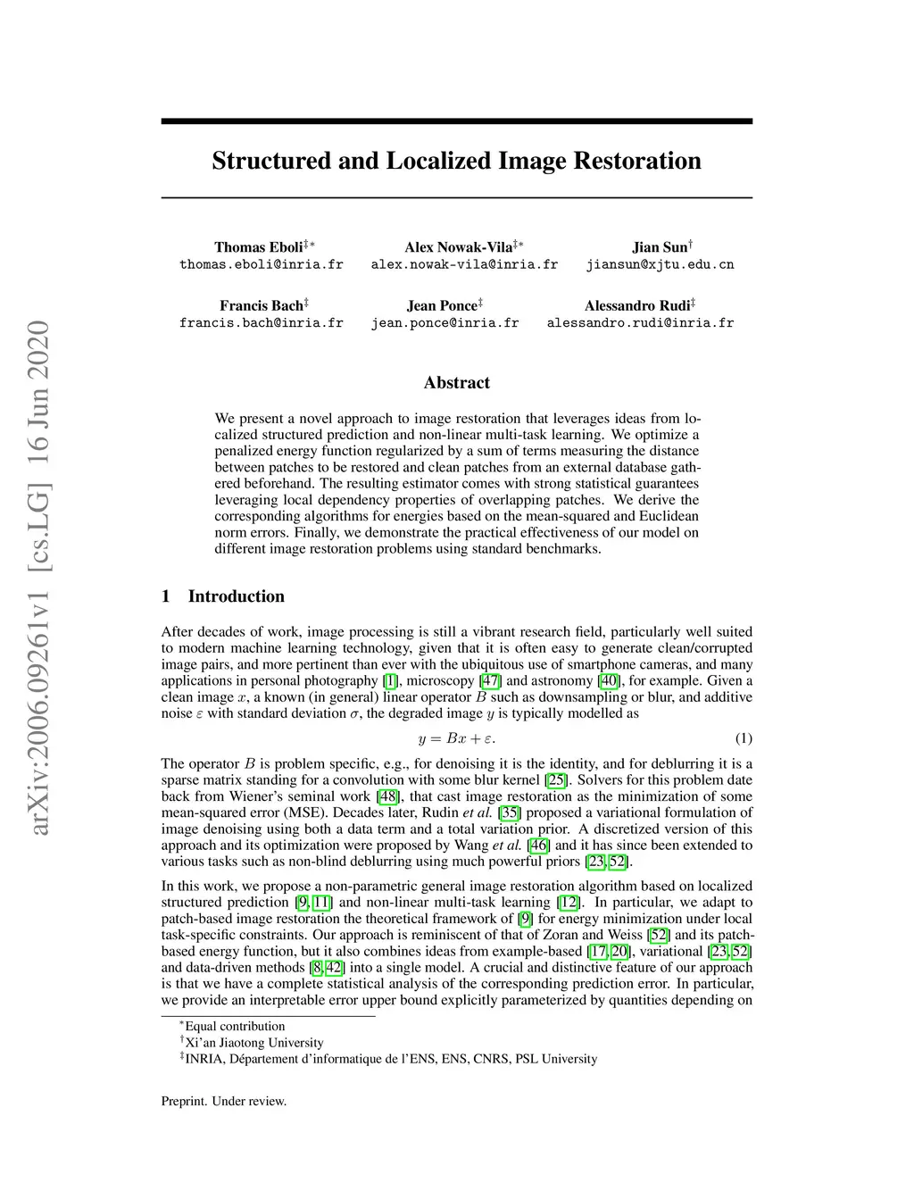 We present a novel approach to image restoration that leverages ideas from localized structured prediction and non-linear multi-task learning. We optimize a penalized energy function regularized by a sum of terms measuring the distance between patches to be restored and clean patches from an external database gathered beforehand. The resulting estimator comes with strong statistical guarantees leveraging local dependency properties of overlapping patches. We derive the corresponding algorithms for energies based on the mean-squared and Euclidean norm errors. Finally, we demonstrate the practical effectiveness of our model on different image restoration problems using standard benchmarks.