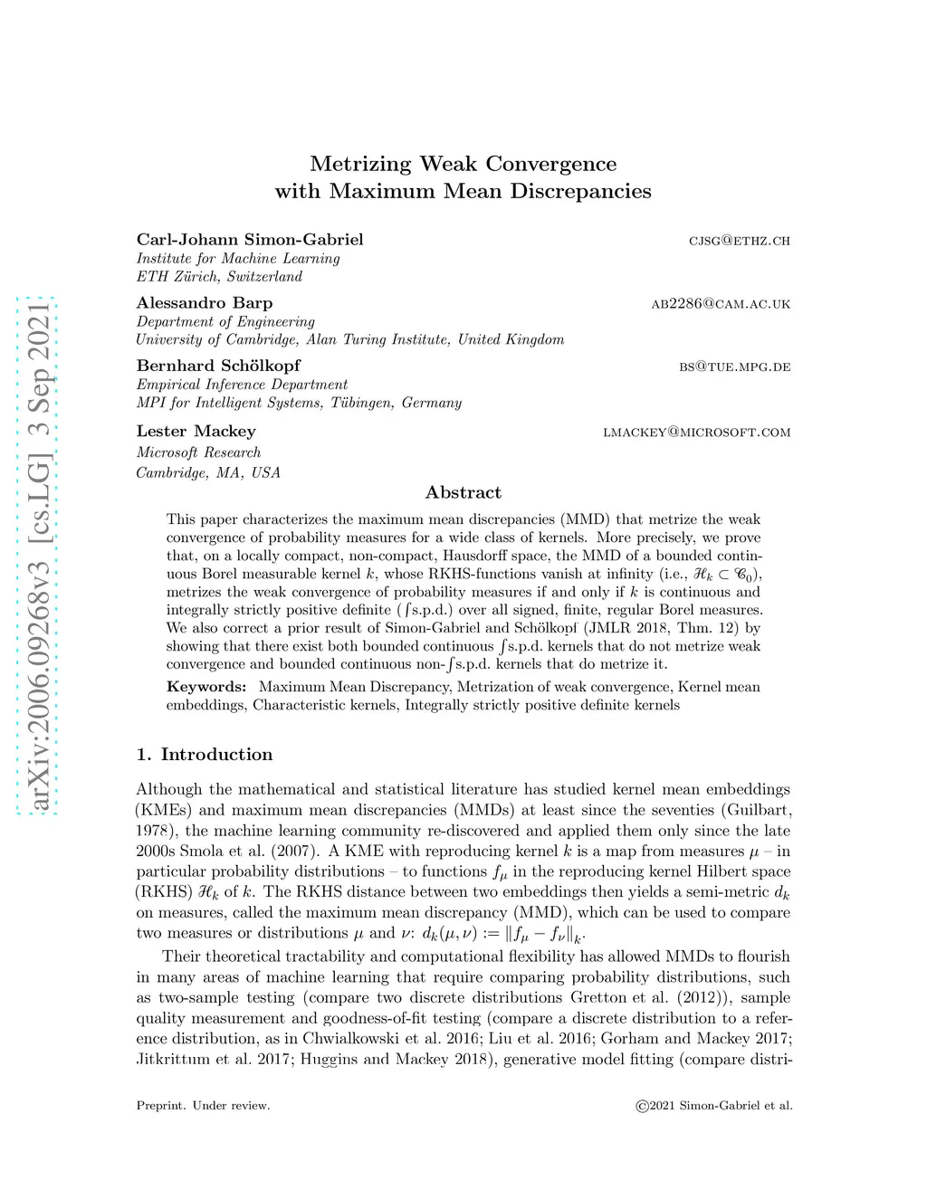 This paper characterizes the maximum mean discrepancies (MMD) that metrize the weak convergence of probability measures for a wide class of kernels. More precisely, we prove that, on a locally compact, non-compact, Hausdorff space, the MMD of a bounded continuous Borel measurable kernel k, whose reproducing kernel Hilbert space (RKHS) functions vanish at infinity, metrizes the weak convergence of probability measures if and only if k is continuous and integrally strictly positive definite (i.s.p.d.) over all signed, finite, regular Borel measures. We also correct a prior result of Simon-Gabriel & Sch\"olkopf (JMLR, 2018, Thm.12) by showing that there exist both bounded continuous i.s.p.d. kernels that do not metrize weak convergence and bounded continuous non-i.s.p.d. kernels that do metrize it.