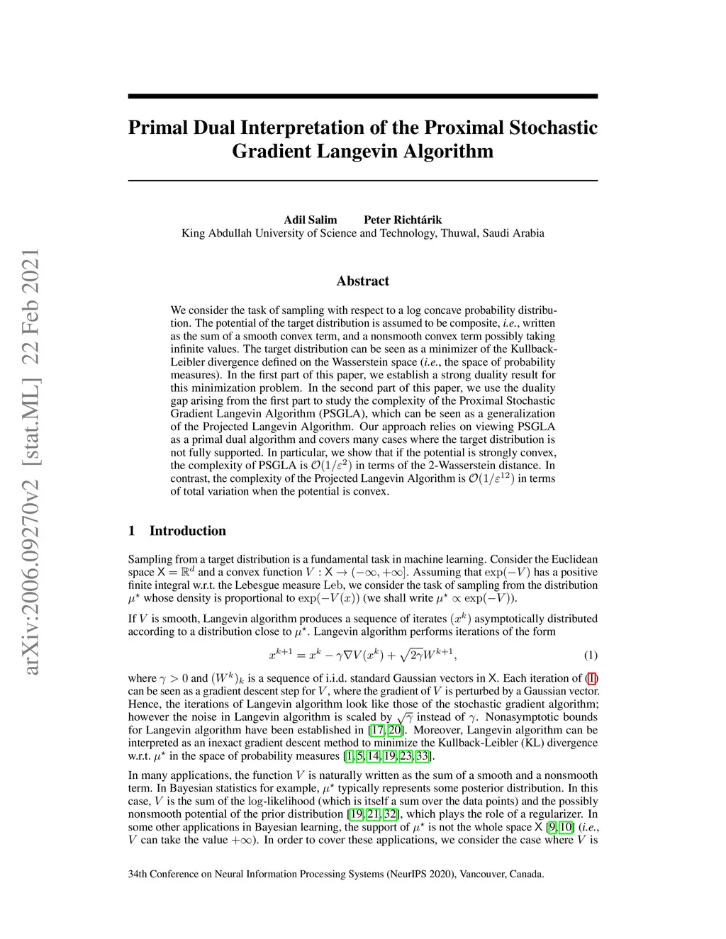 We consider the task of sampling with respect to a log concave probability distribution. The potential of the target distribution is assumed to be composite, \textit{i.e.}, written as the sum of a smooth convex term, and a nonsmooth convex term possibly taking infinite values. The target distribution can be seen as a minimizer of the Kullback-Leibler divergence defined on the Wasserstein space (\textit{i.e.}, the space of probability measures). In the first part of this paper, we establish a strong duality result for this minimization problem. In the second part of this paper, we use the duality gap arising from the first part to study the complexity of the Proximal Stochastic Gradient Langevin Algorithm (PSGLA), which can be seen as a generalization of the Projected Langevin Algorithm. Our approach relies on viewing PSGLA as a primal dual algorithm and covers many cases where the target distribution is not fully supported. In particular, we show that if the potential is strongly convex, the complexity of PSGLA is in terms of the 2-Wasserstein distance. In contrast, the complexity of the Projected Langevin Algorithm is in terms of total variation when the potential is convex.
