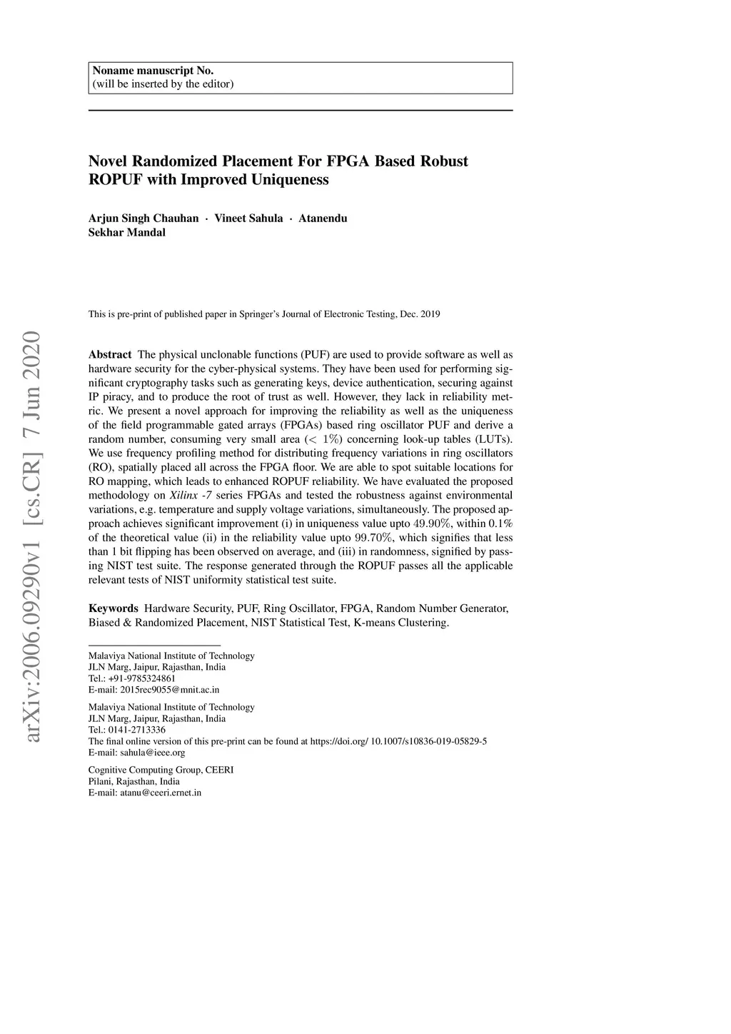 Novel Randomized Placement for FPGA Based Robust ROPUF with Improved