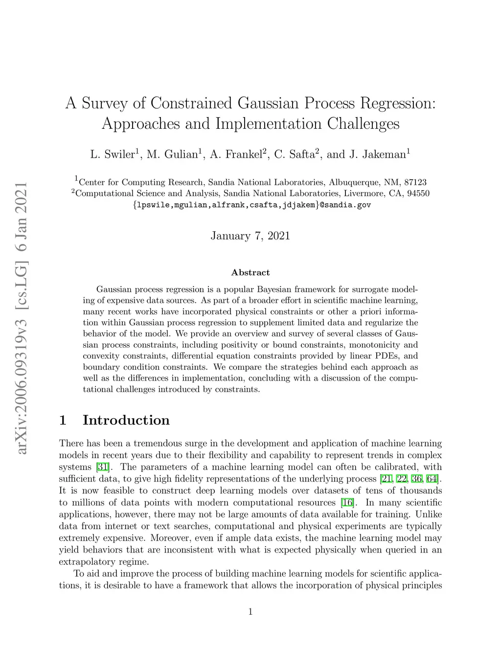 Gaussian process regression is a popular Bayesian framework for surrogate modeling of expensive data sources. As part of a broader effort in scientific machine learning, many recent works have incorporated physical constraints or other a priori information within Gaussian process regression to supplement limited data and regularize the behavior of the model. We provide an overview and survey of several classes of Gaussian process constraints, including positivity or bound constraints, monotonicity and convexity constraints, differential equation constraints provided by linear PDEs, and boundary condition constraints. We compare the strategies behind each approach as well as the differences in implementation, concluding with a discussion of the computational challenges introduced by constraints.