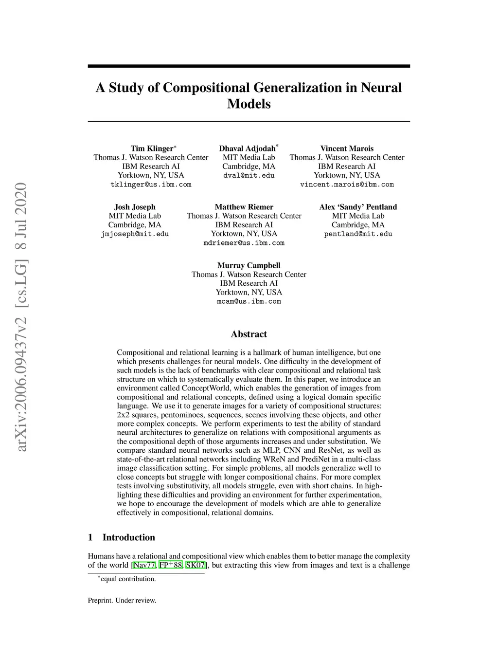Compositional and relational learning is a hallmark of human intelligence, but one which presents challenges for neural models. One difficulty in the development of such models is the lack of benchmarks with clear compositional and relational task structure on which to systematically evaluate them. In this paper, we introduce an environment called ConceptWorld, which enables the generation of images from compositional and relational concepts, defined using a logical domain specific language. We use it to generate images for a variety of compositional structures: 2x2 squares, pentominoes, sequences, scenes involving these objects, and other more complex concepts. We perform experiments to test the ability of standard neural architectures to generalize on relations with compositional arguments as the compositional depth of those arguments increases and under substitution. We compare standard neural networks such as MLP, CNN and ResNet, as well as state-of-the-art relational networks including WReN and PrediNet in a multi-class image classification setting. For simple problems, all models generalize well to close concepts but struggle with longer compositional chains. For more complex tests involving substitutivity, all models struggle, even with short chains. In highlighting these difficulties and providing an environment for further experimentation, we hope to encourage the development of models which are able to generalize effectively in compositional, relational domains.